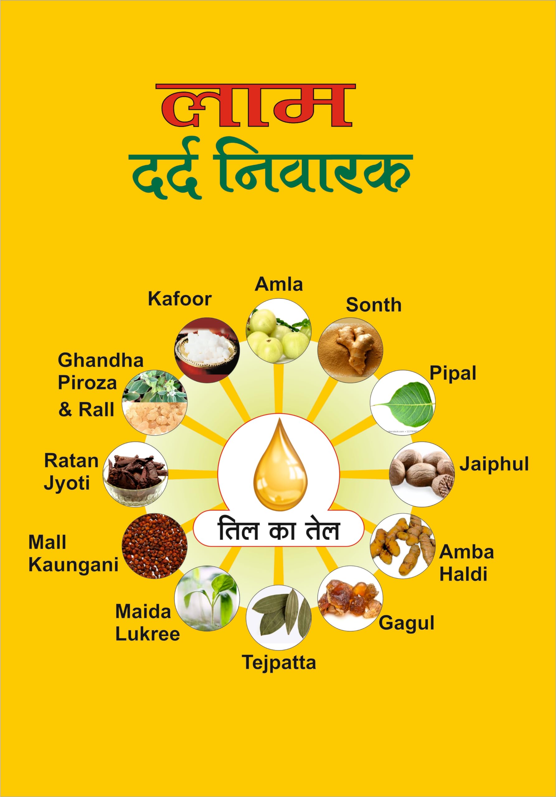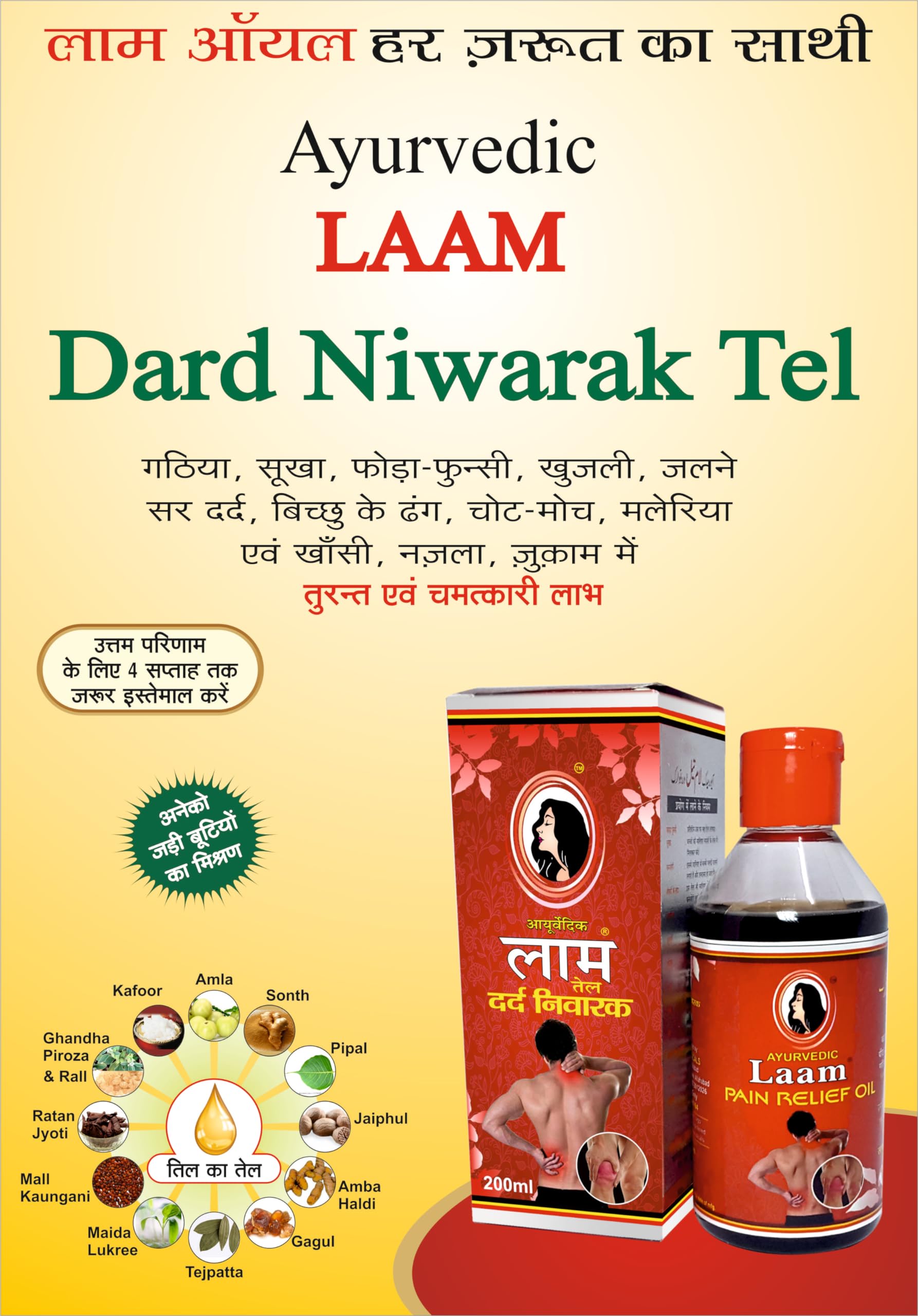 Ayurvedic oil / Dard Niwarak Tel. Since 1991 Laam is associated with its people to help them to get from their naturally. Laam or dardniwarak oil consists of more than 14 different natural herbs which gives it a very dark red color a very aromatic natural scent and also make the oil so effective. It consists of analgesic; anti-rheumatic anti-arthritic anti-spasmodic anti-septic and astringent properties which help heal any kind of wound or swelling very fast. Laam oil is an alternative and complementary therapy that relaxes and solace from various s like Joint muscle back chest etc. it is also helpful in any kind of muscular or skeletal problems. As Laam oil does not have any harmful side effects it can be also used for massage to keep the healthy and strong. For better results heat the oil before applying on any affected part of the body and use the oil two to three times a day.