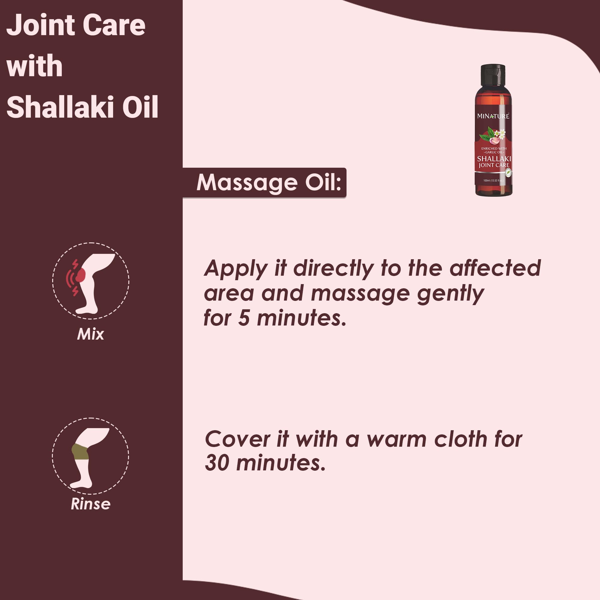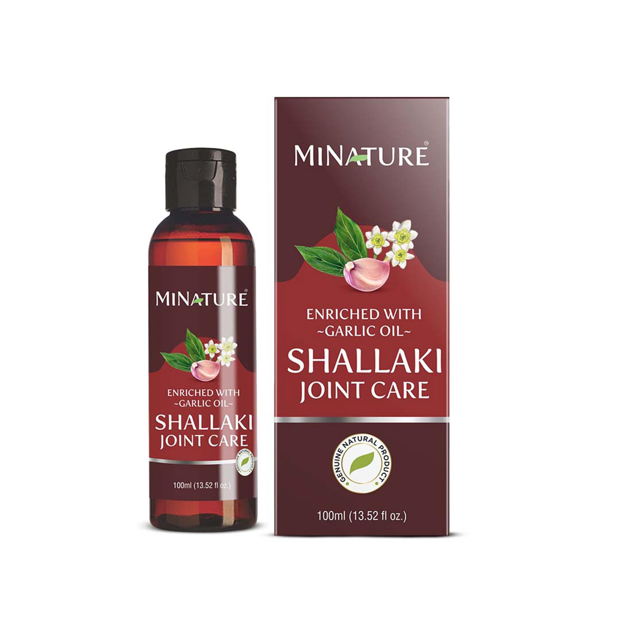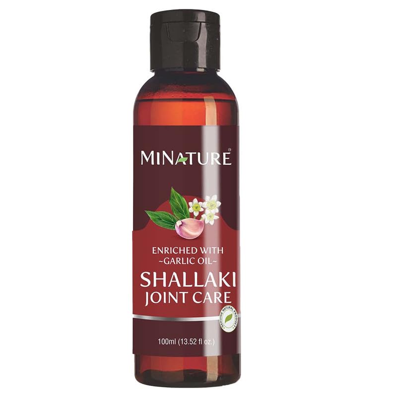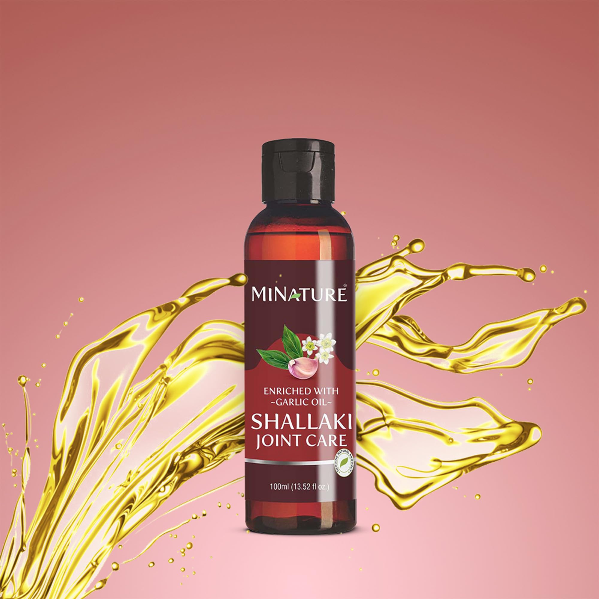 mi nature Shallaki Joint Care OilComforting Massage Oil Inspired by Traditional Practicesmi nature Shallaki Joint Care Oil brings together the time-honored benefits of Shallaki (Boswellia serrata) and the warming essence of garlic oil in a carefully crafted plant-based formula. Designed for those who value natural self-care this oil is ideal for post-activity massage or part of your daily wellness routine.Pure & Purposeful FormulationThis oil contains only thoughtfully selected natural ingredientsâno artificial colors no synthetic perfumes and no mineral oils. The gentle warmth of garlic oil combines with the balancing properties of Shallaki to provide a grounding massage experience that promotes comfort and ease.Usage Tips:Take a small amount of oil in your palmMassage gently into the desired area with circular strokesAllow the oil to absorb for 20-30 minutes before bathing or leave overnightUse daily or as needed for best resultsStorage Instructions:Keep in a cool dry place away from direct sunlight. Ensure the cap is tightly closed after each use to maintain freshness.Our Commitment:At mi nature we are dedicated to creating pure and natural products that honor traditional wellness systems. Each ingredient is ethically sourced carefully processed and thoughtfully packaged to deliver the best of nature to you.Reconnect with comfort and careânaturallyâwith mi nature Shallaki Joint Care Oil.