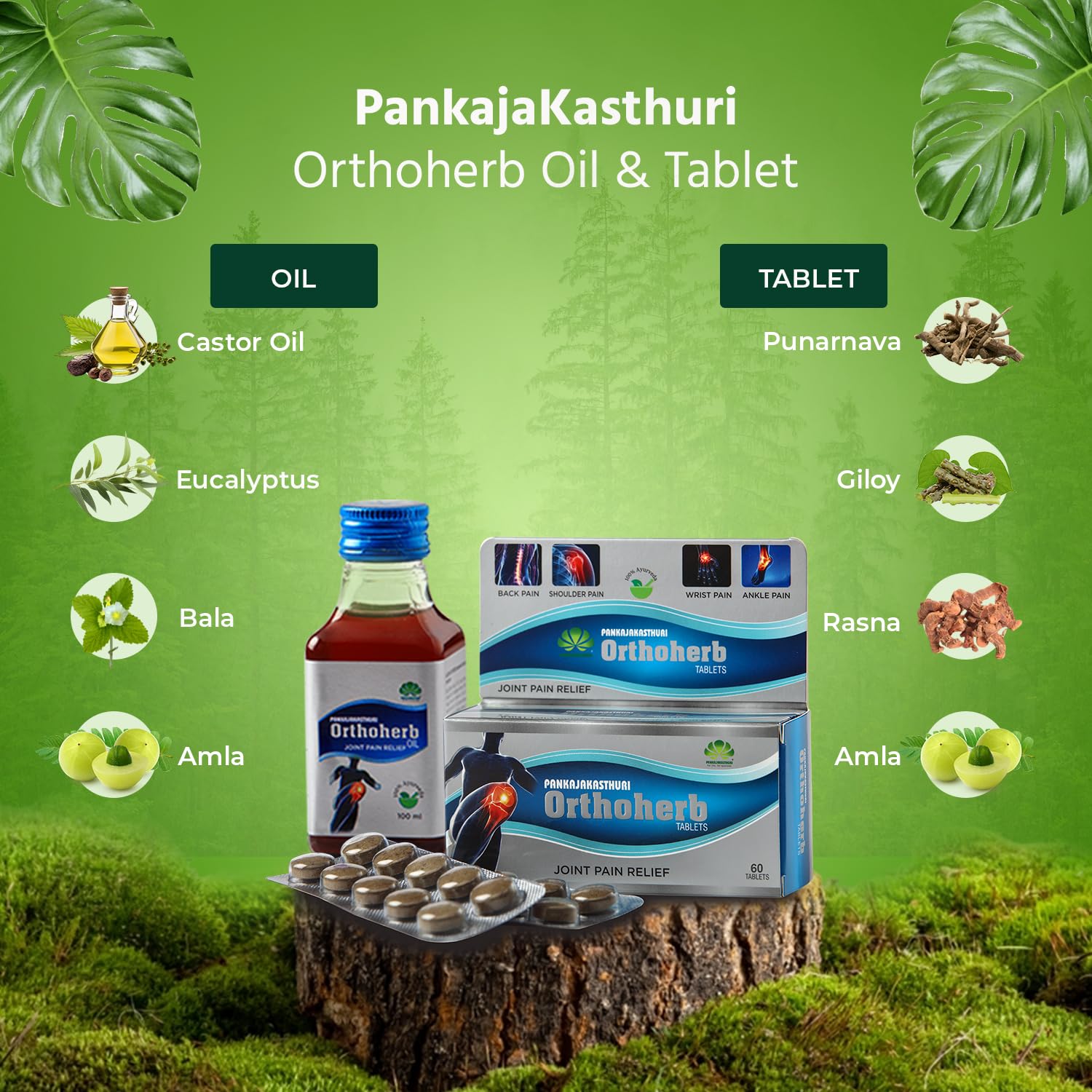 Pankajakasthuri Orthoherb Oil + Tablet Ayurvedic Pain Relief from Joint Muscle Back Pain Sprains Sports injuries reducing Inflammation and Sciatica - 100 ml + 60Tabs