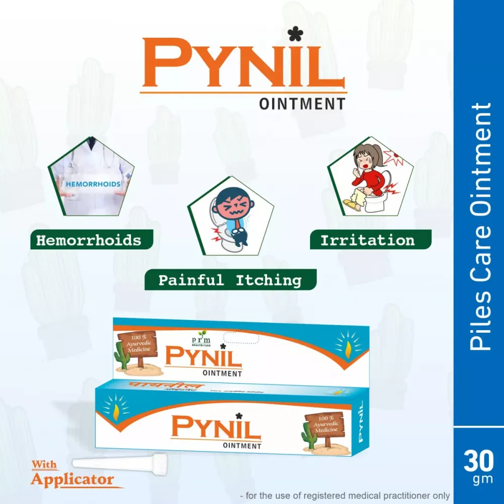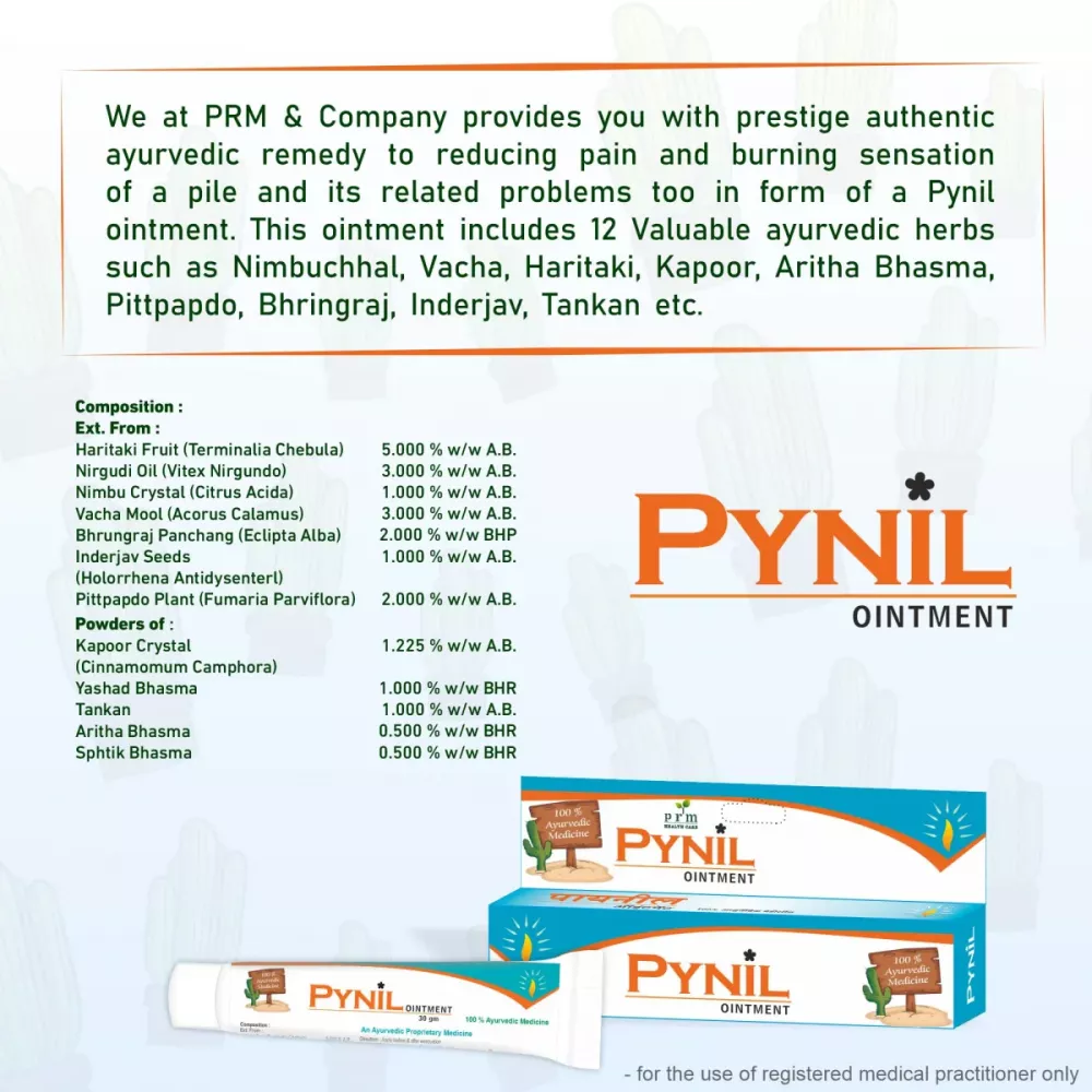 Pynil ointment is a piles reliever cream made with prestige authentic ayurvedic contains for reducing pain and burning sensation of a piles and its related problem. it cames in existence through mixing of total 12 selected herbs created namely Aritha Bhasma, Pittpapdo seeds, Haritaki Fruit, tankan, Nirgudi Oil, Inderjav seeds and many more.