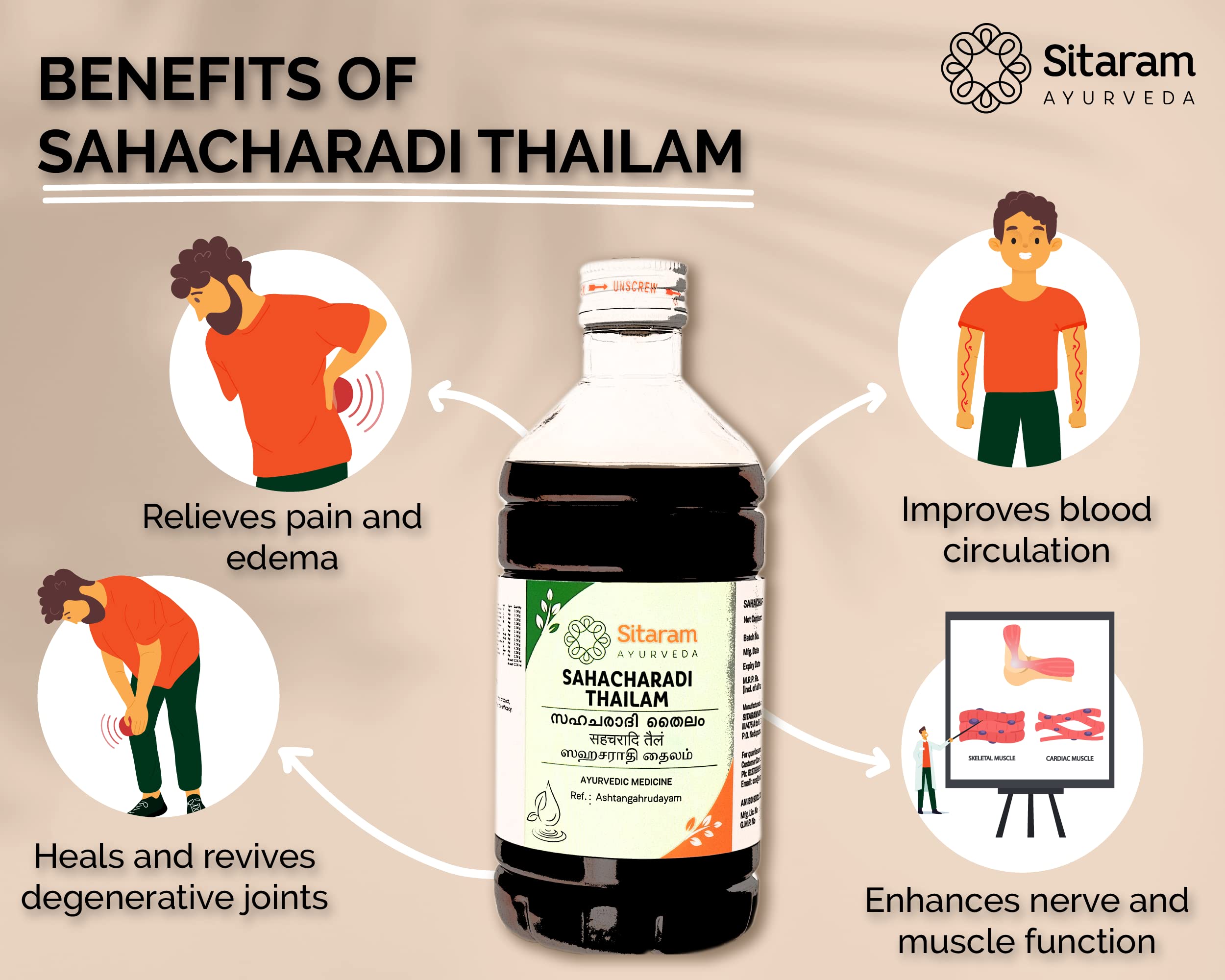 • Enhances nerve and muscle function: Sahacharadi thailam Beneficial in the management of pies muscle wasting nerve debility muscular s and aches.