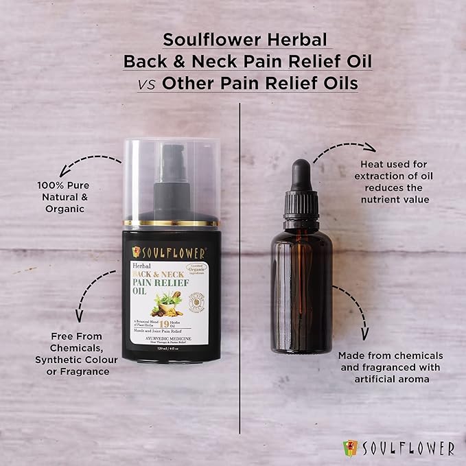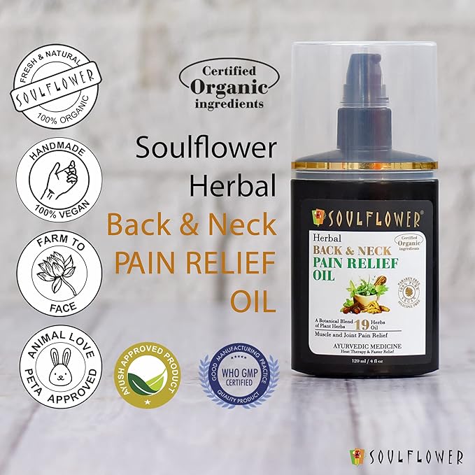 Soulflower Back Pain Relief Oil | Neck, Leg, Knee, Joint & Muscle Pain | Shatavari, Eucalyptus, Ayurvedic Botanical Blend of 19 Plant Herbs, Extracts, Certified Organic Ingredients, 120 ml