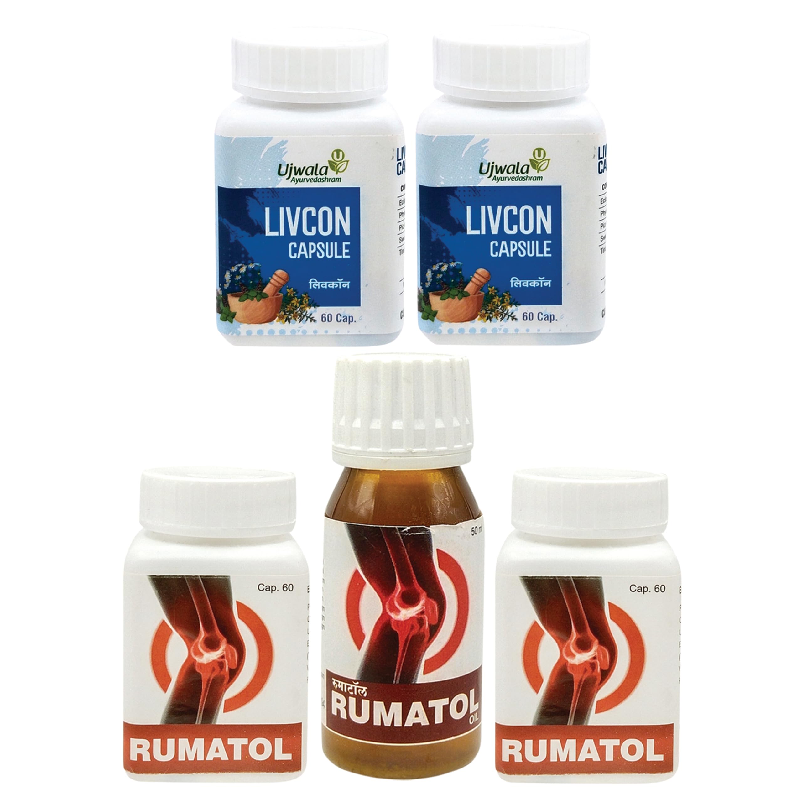 Ujwala Ayurvedashram Rumatol Livcon Capsule And Rumatol (50Ml) One Month Kit Joint Muscle & Knee Pain Fast Relief
