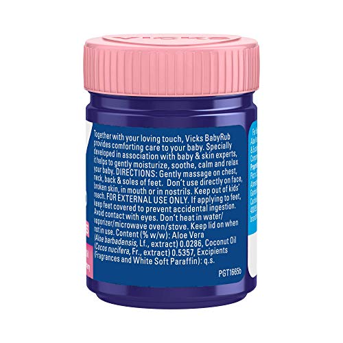 Introducing NEW Vicks BabyRub â specially developed for your baby in association with baby and skin experts. It contains Aloe Vera Coconut Oil and fragrances of Lavender & Rosemary. Together with your loving touch it helps to gently moisturize soothe and relax your baby. Suitable for babies 3 months and above. A good babyrub massage can help your babyâs skin retain moisture and stay soft making your baby feel more comfortable. Directions of use: Apply on chest neck back and soles of feet for moisturizing and soothing baby care. Specially developed in association with baby and skin experts Vicks babyrub is suitable for babies 3 months and above. It has a long history in USA Canada Australia and new Zealand. With millions of packs sold moms worldwide have trusted Vicks babyrub for their babies.
