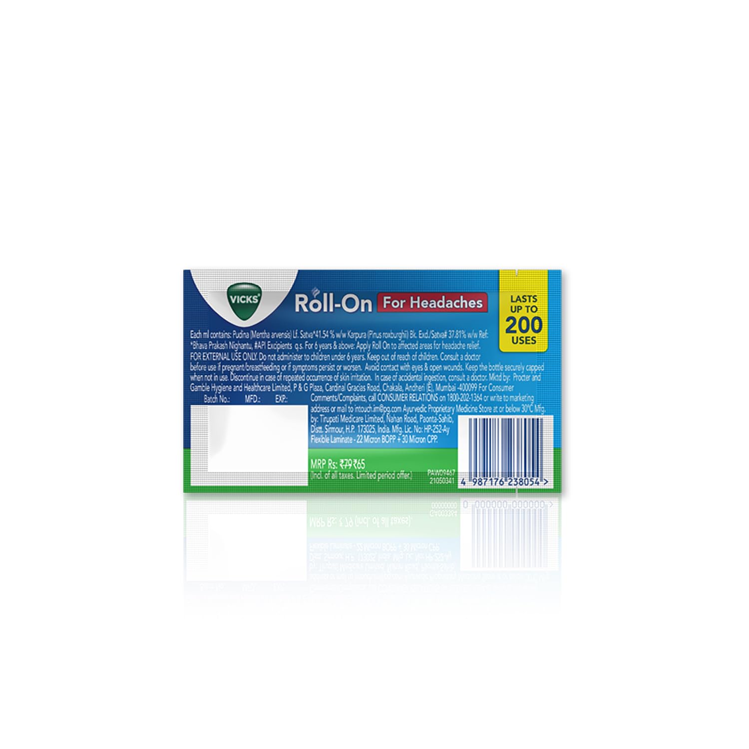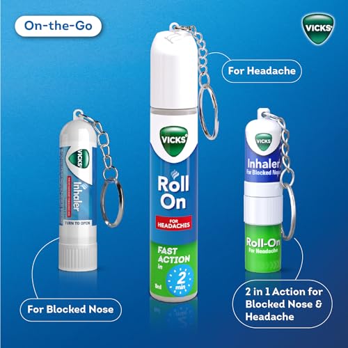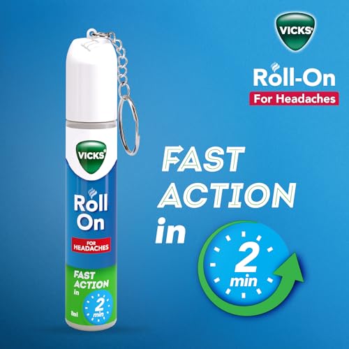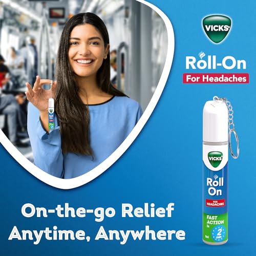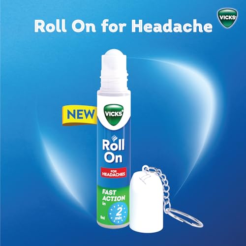 FAST ACTION IN 2 MINUTES: NEW Vicks Roll-On has a fast vapor action formula that starts working in only 2 minutes. NON-GREASY FORMULA WITH PROVEN AYURVEDIC INGREDIENTS: NEW Vicks Roll-On has menthol and camphor that are known to be proven ayurvedic ingredients for headache relief.ROLLER BALL TECHNOLOGY: NEW Vicks Roll-On comes with a roller ball technology for effective application that can last up to 200 uses.EASY TO CARRY: NEW Vicks Roll-On comes with a keychain so you can carry and use it for headache relief anytime anywhere.