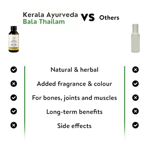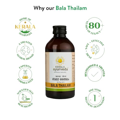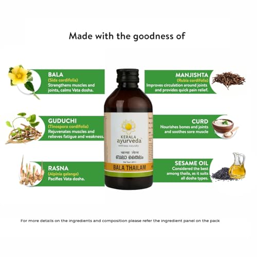 Size:Pack of 1 - 200 MlBala Thailam ofKERALA ayurveda Ltd is an effective combination of around 52 ingredients in the right proportion. Prepared in Tila thailam (sesame oil) with the goodness of goats milk Bala Thailam is renowned for its effect in arthritis and neurological diseses. The presence of drugs which are good painn relieving agents compliments the main ingredient Bala (Sida cordifolia) in its therapeutic actions.