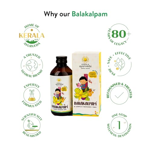 • Quantity: 200 ml; Item Form: Tonic Balakalpam is a pleasant tasting complete herbal tonic for that contains herbs essential for improving Imune health Digesstion and overall growth. Musta (Cyperus rotundus) the prime ingredient along with other herbs proc