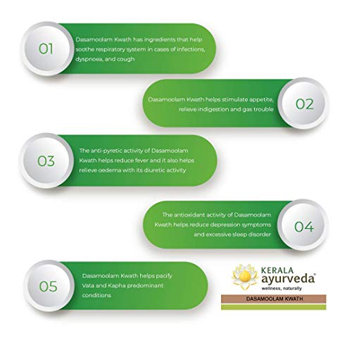 Dasamoolam Kwath is a classical Ayurveda formulation beneficial in respiratory disorders. It aids releff in respiratory infections dyspnoea and and helps relieve InDigesstionn and gass trouble. Dasamoolam Kwath helps fever due to its anti-pyretic activity and also beneficial in reducing oedema. the intake of Dasamoolam Kwath helps improve excessive sleep and also beneficial in Deepression.