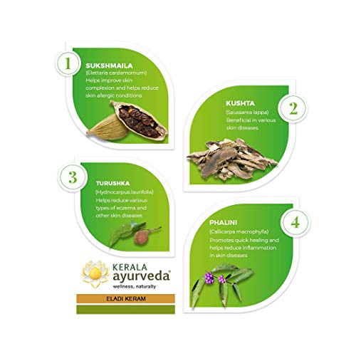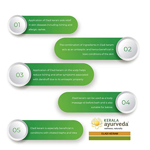 Size:Pack of 1 - 200 MlEladi Keram is a classical Ayurveda formulation with coconut oil as the base. It is used for various skin disorders as an external application. Eladi keram helps the symptoms associated with inflamtory and toxic skin conditions. It helps promote complexion and can be used for a Small massage before bath.