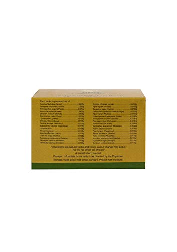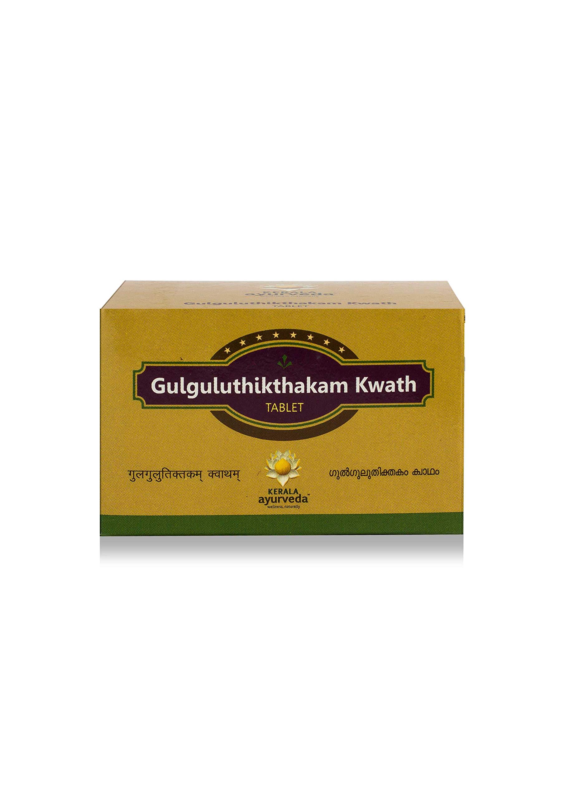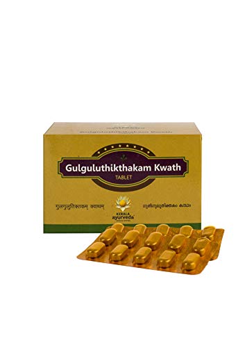 Ingredients: Gulguluthikthakam kwath tablet (qty./Tab) nimba (azadirachta indica) - 0.675 G amruthu (tinospora cordifolia) - 0.65 G vasaka (adathoda vasica) - 0.675 G patola (trichosanthes cucumerina) - 0.675 G brahati (solanum indicum) - 0.675 G gulgulu (commiphora mukul) - 0.27 G patha (cyclea peltala) - 0.0135 G vidanga (embelia ribes) - 0.0135 G devadaru (cedrus deodara) - 0.0135 G gajapippali (balanosphora fungose) - 0.0135 G chavarkaram (carbonate of potash) - 0.0135 G thuvarchilakkaram (sodium sulphate) - 0.0135 G sunthi (zingiber officinale) - 0.0135 G haridra (curcuma longa) - 0.0135 G satahua (peucedanum graveolens) - 0.0135 G chavyam (piper nigrum) - 0.0135 G kushta (saussurea lappa) - 0.0135 G jyothishmati (celastrus paniculata) - 0.0135 G maricha (piper nigrum) - 0.0135 G kutaja (holarrhena antidysenterica) - 0.0135 G ajmoda (trachyspermum ammi) - 0.0135 G chitraka (plumbago indica) - 0.0135 G kutki (picrorrhiza kurroa) - 0.0135 G bhallataka (semicarpus anacardium) - 0.0135 G vacha (acorus calamus) - 0.0135 G pippalimool (piper longum) - 0.0135 G raasna (alpinia officinarum) - 0.0135 G jeera (cuminum cyminum) - 0.0135 G ativisha (aconitum heterophyllum) - 0.0135 G manjishta (rubia cordifolia) - 0.0135 G hareethaki (terminalia chebula) - 0.0135 G amlaki (embilica officinalis) - 0.0135 G bibhitaki (terminalia belerica) - 0.0135 G.
