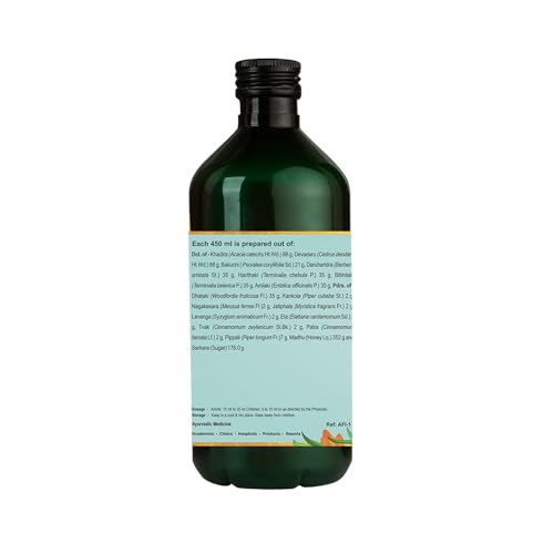 Khadira Acacia catechu Ht.Wd. Dct. 85.0 g Devadaru Cedrus deodara Ht.Wd. Dct. 85.0 g Bakuchi Psoralea corylifolia Sd. Dct. 20.4 g Daruharidra Berberis aristata St. Dct. 3.4 g Harithaki Terminalia chebula P. Dct. 3.4 g Bibhitaki Terminalia belerica P. Dct. 3.4 g Amlaki Emblica officinalis P. Dct. 3.4 g Madhu Honey Lq. 339.8 g Sarkara Sugar 169.9 g Dhataki Woodfordia fruticosa Fl. Pdr. 3.4 g Kankola Piper cubeba St. Pdr. 1.7 g Nagakesara Messua ferrea Fl. Pdr. 1.7 g Jatiphala Myristica fragrans Fr. Pdr. 1.7 g Lavanga Syzygium aromaticum Fr. Pdr. 1.7 g Ela Elattaria cardamomum Sd. Pdr. 1.7 g Tvak Cinnamomum zeylanicum St.Bk. Pdr. 1.7 g Patra Cinnamomum tamala Lf. Pdr. 1.7 g Pippali Piper longum Fr. Pdr. 6.8 g