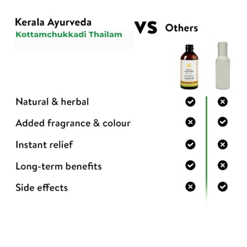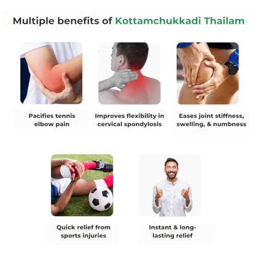 Kottamchukkadi thailam is renowned for its therapeutical benefits on Vata disorders. Highly acclaimed for its painn relieving action Kottamchukkadi thailam helps subside in joint disorders. It is beneficial in Sciatica Spondylosis Arthritis Myalgia and Tennis elbow. Kottamchukkadi Thailam helps numbness and stiffness in Vata predominant conditions.