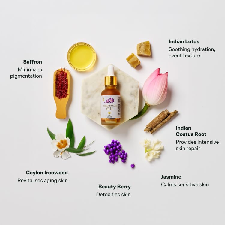 Size:Packof 1 - 10 MlKumkumadi Oil Kumkumadi oil is formulated to help skin look young and healthy. In Ayurveda it is known as 'saffron oil' and it helps illuminate skin color. It lightens complexion makes skin fair and add radiance to the skin. This skin oil also removes pimples blemishes scars and wrinkles naturally. Benefits Helps alleviate skin dryness:- Kumkumadi oil imparts moisturisation and helps in smoothening the skin naturally. Helps lighten dark spots and blemishes:- The thoughtful blend of herbs in Kumkumadi oil helps lighten the dark spots and blemishes and imparts new glow and radiance to the face. Helps remove dark circle:- Kumkumadi oil is rich in ingredients with antioxidant property and thus helps dark circles. Helps scar marks:- Kumkumadi oil helps fade off the scars on the face caused by pimples or acne. Helps pacify Pitta and Kapha doshas:- Kumkumadi oil helps in balancing Pitta and Kapha doshas by virtue of its ingredients. How to use: Apply few drops on the face & massage no need to wash off. Product Ingredients: Kumkuma (Crocus sativus):- helps enhance complexion and scars and marks. Chandana (Pterocarpus santalinus):- Pacifies Pitta and enhances natural glow of skin. Manjishta (Rubia cordifolia):- improves skin lustre and lightens the skin. Indications Acne Pimples Dark circle under the eyes.