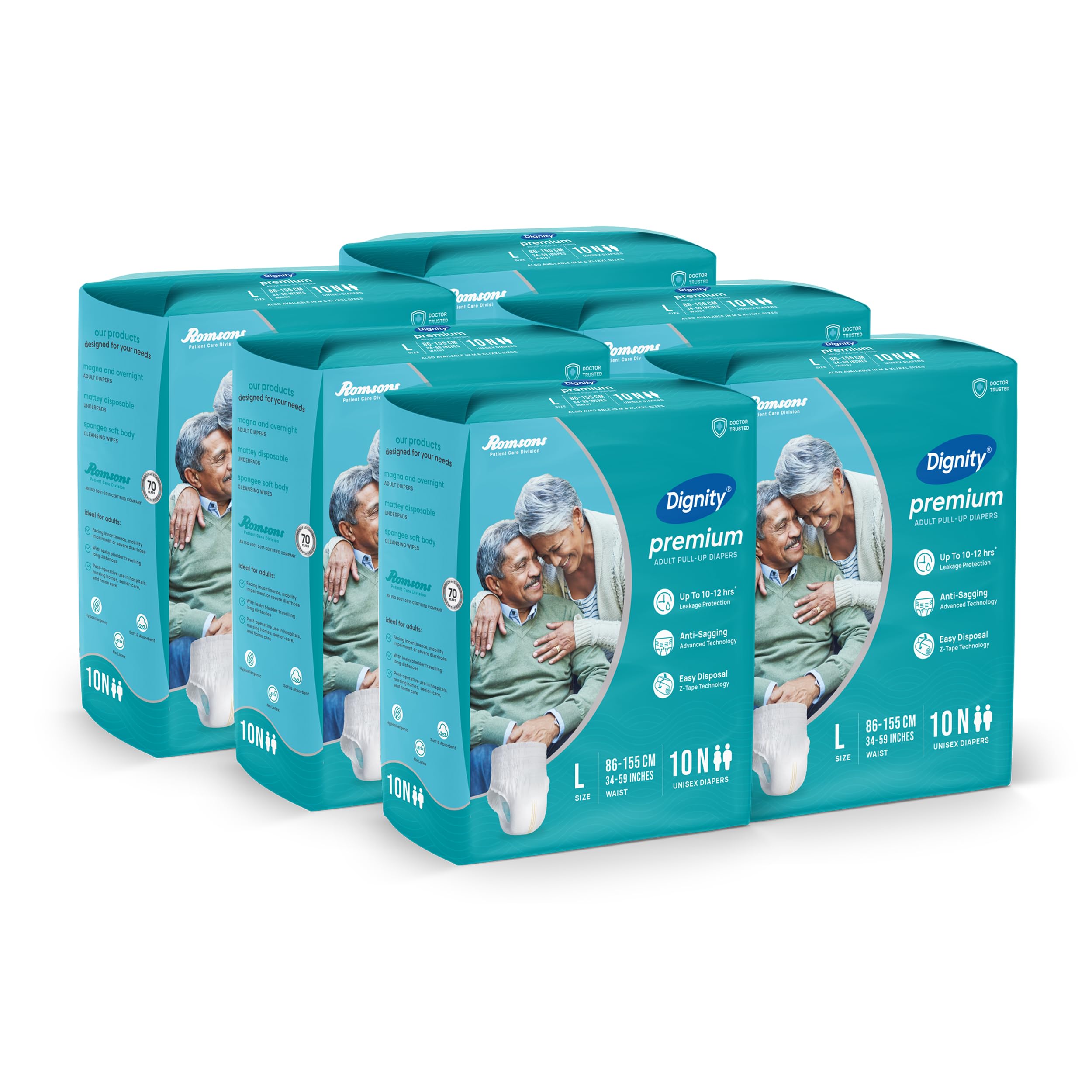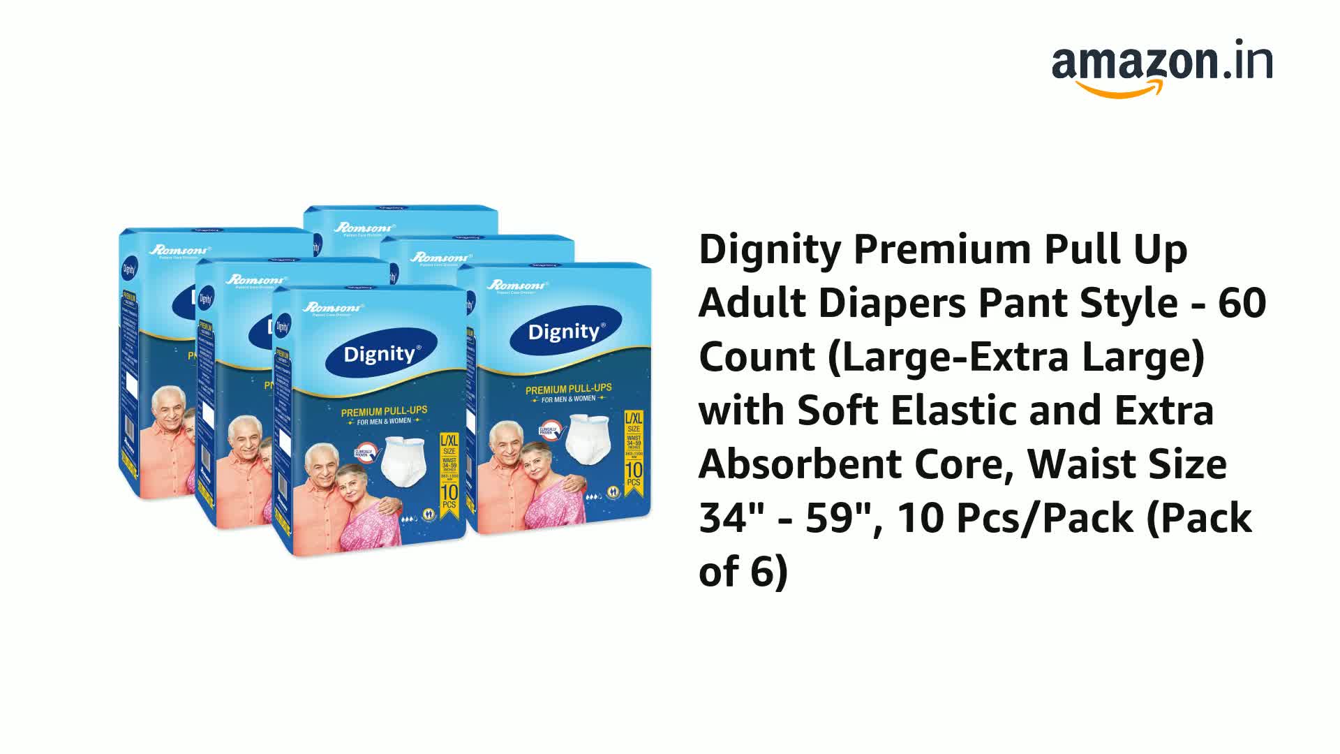 • Dignity Premium Pull-Up Adult Diapers are underwear style diapers designed for involuntary urination or defecation in both men & women. Premium Pull-Ups provide Protection for up to 10-12 hours.