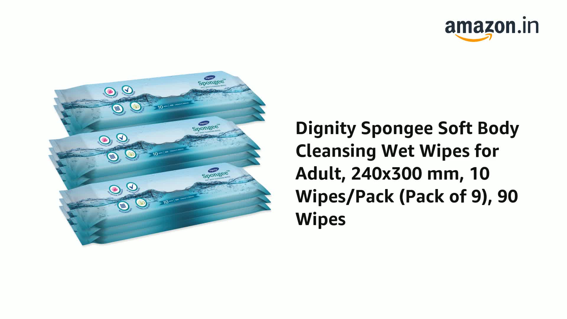 Dignity Spongee Soft Body Cleansing Wet Wipes for Adult, 240x300 mm, 10 Wipes/Pack (Pack of 9), 90 Wipes
