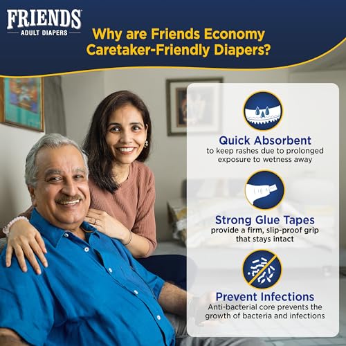 Friends Economy Adult Diapers Tape Style - 120 Count (Extra Large) with odour lock, Unisex, Leakproof, Wetness Indicator and Anti-Bacterial Absorbent Core - Waist Size 32.68-59.84 inch; 83-152 cm
