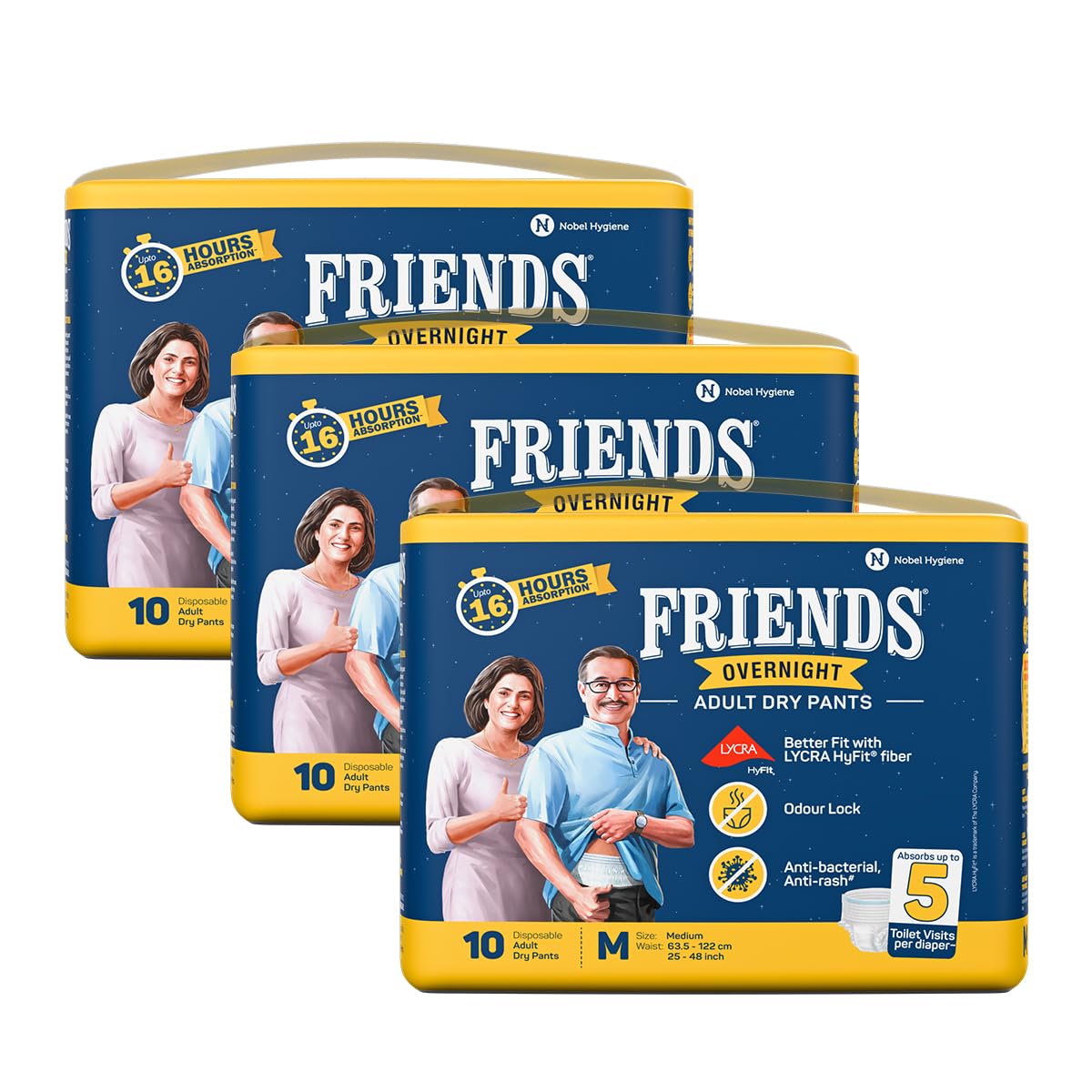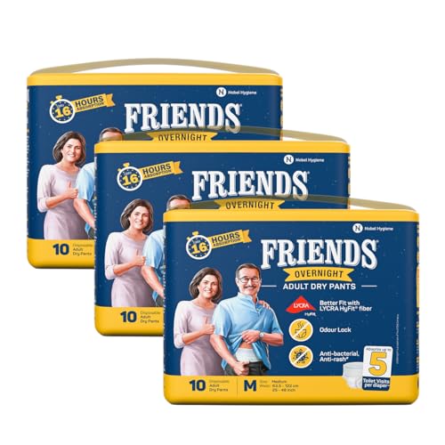 Friends Overnight Adult Diapers Pants Style - 30 Count (Medium) with odour lock, Unisex, Leakproof, Elastic Waist and Anti-Bacterial Absorbent Core - Waist Size 25-48 inch; 63.5-122 cm