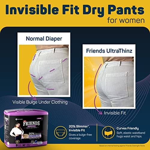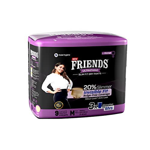Friends UltraThins Slim Fit Adult Diapers (Dry Pants) for Women - Medium – 9 Count - with thin design, peach colour, and anti-rash - Waist Size 25-48 Inch ;6 3.5-122 cm