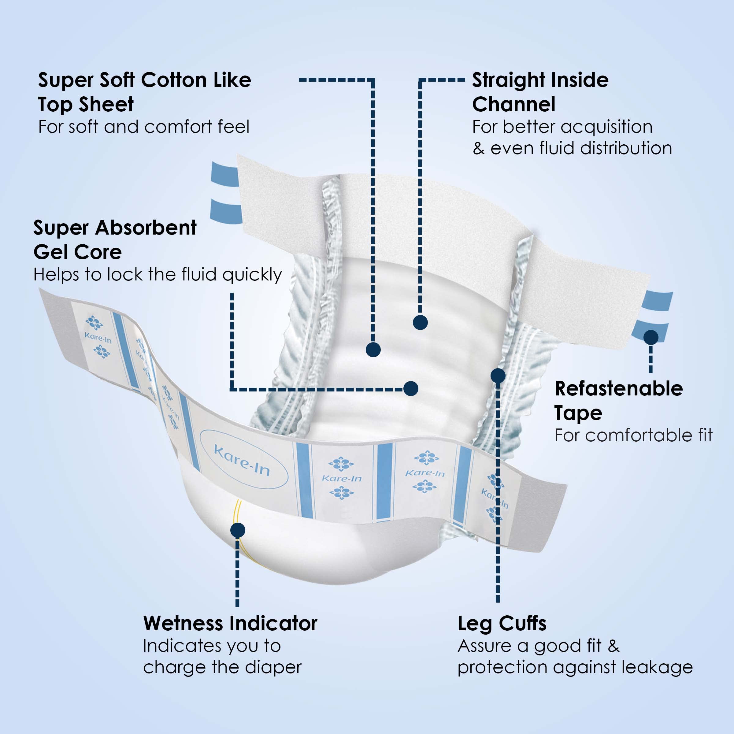 Netted Channel for faster liquid absorption. Improved leg cuffs New Frontal refasten tape absorbent inner layer. Wetness indicator Unisex Super soft Back sheet
