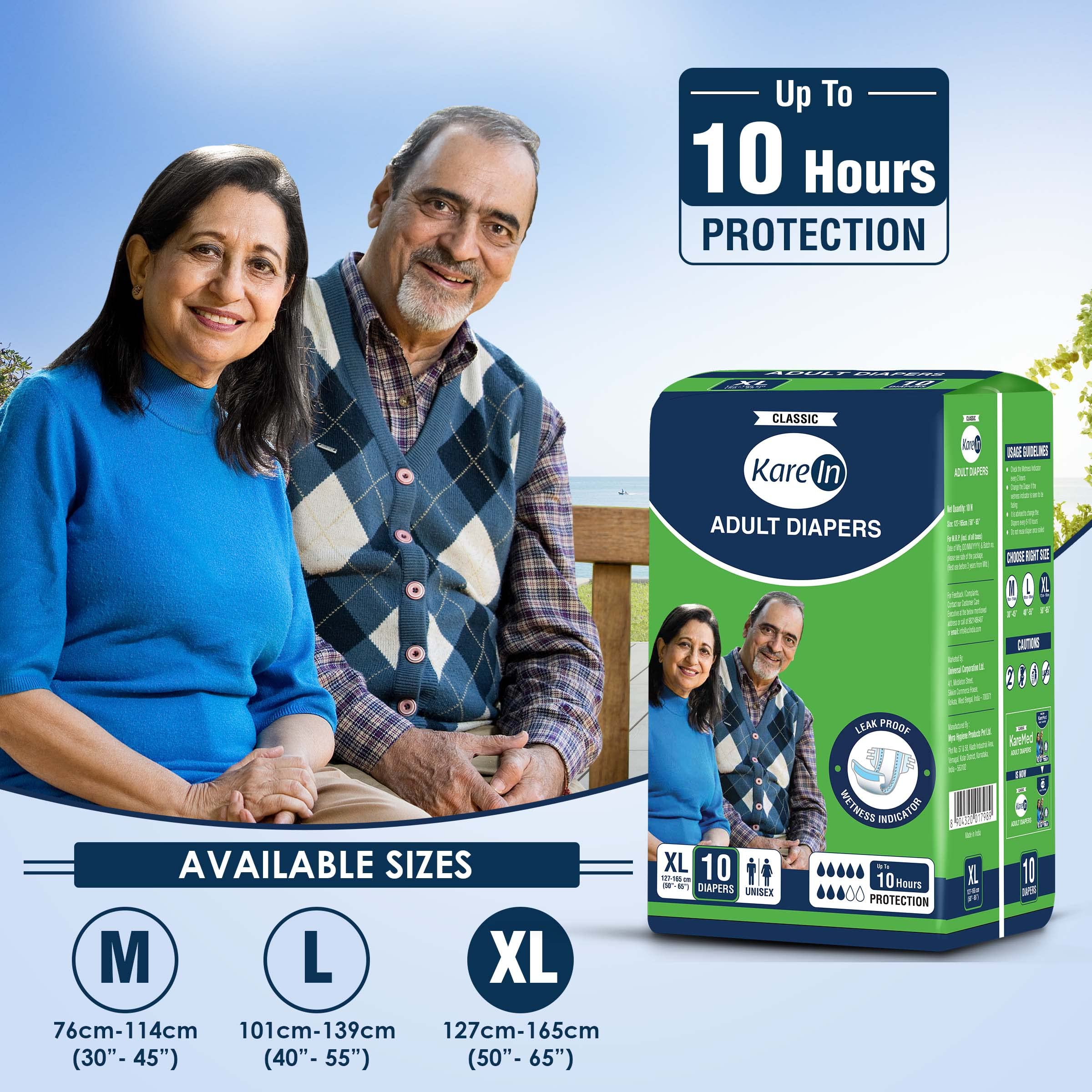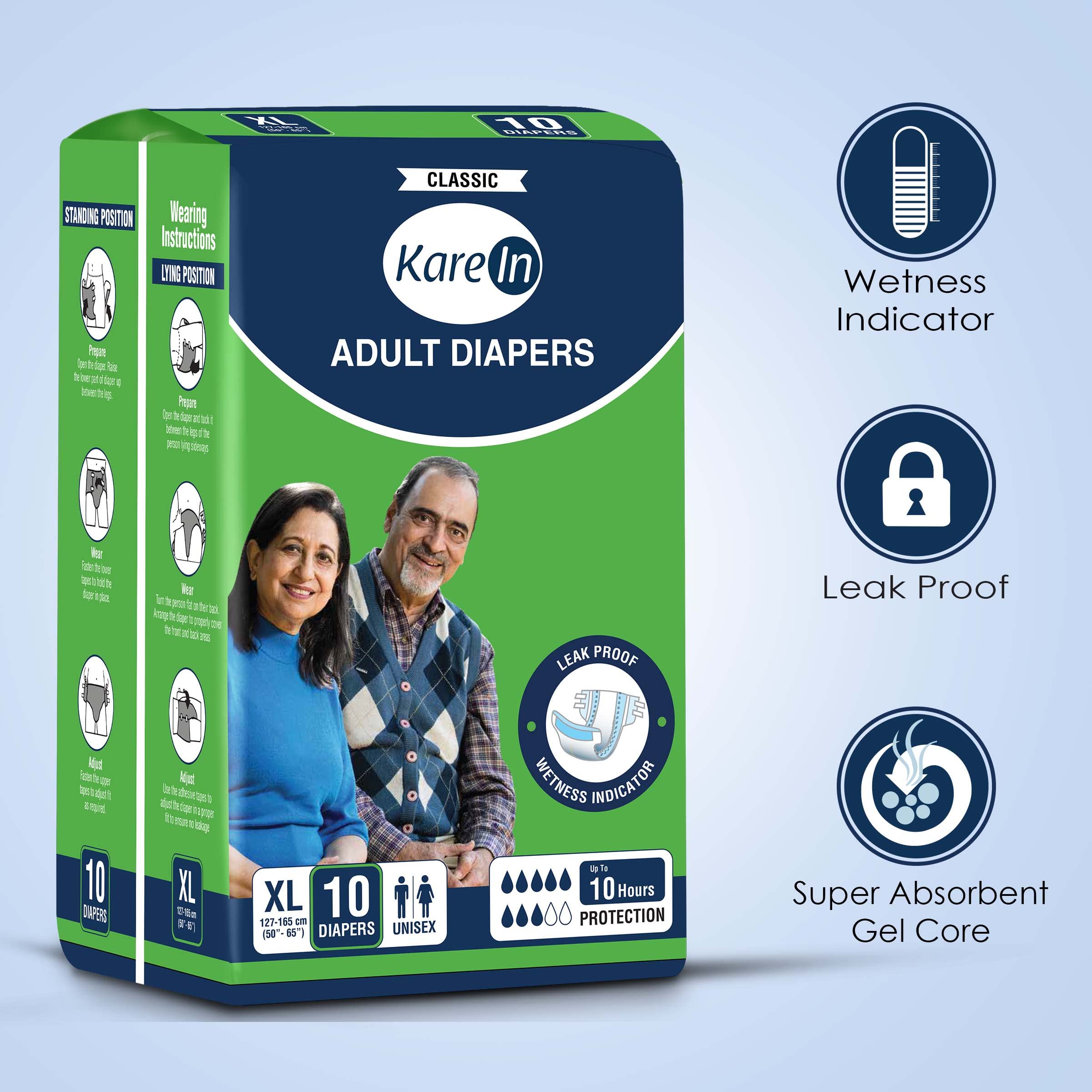KareIn Classic Adult Diapers Extra Large Waist Size 127-165 Cm (50"-65") 10 Count Tape Style Unisex High Absorbency Leak Proof Wetness Indicator