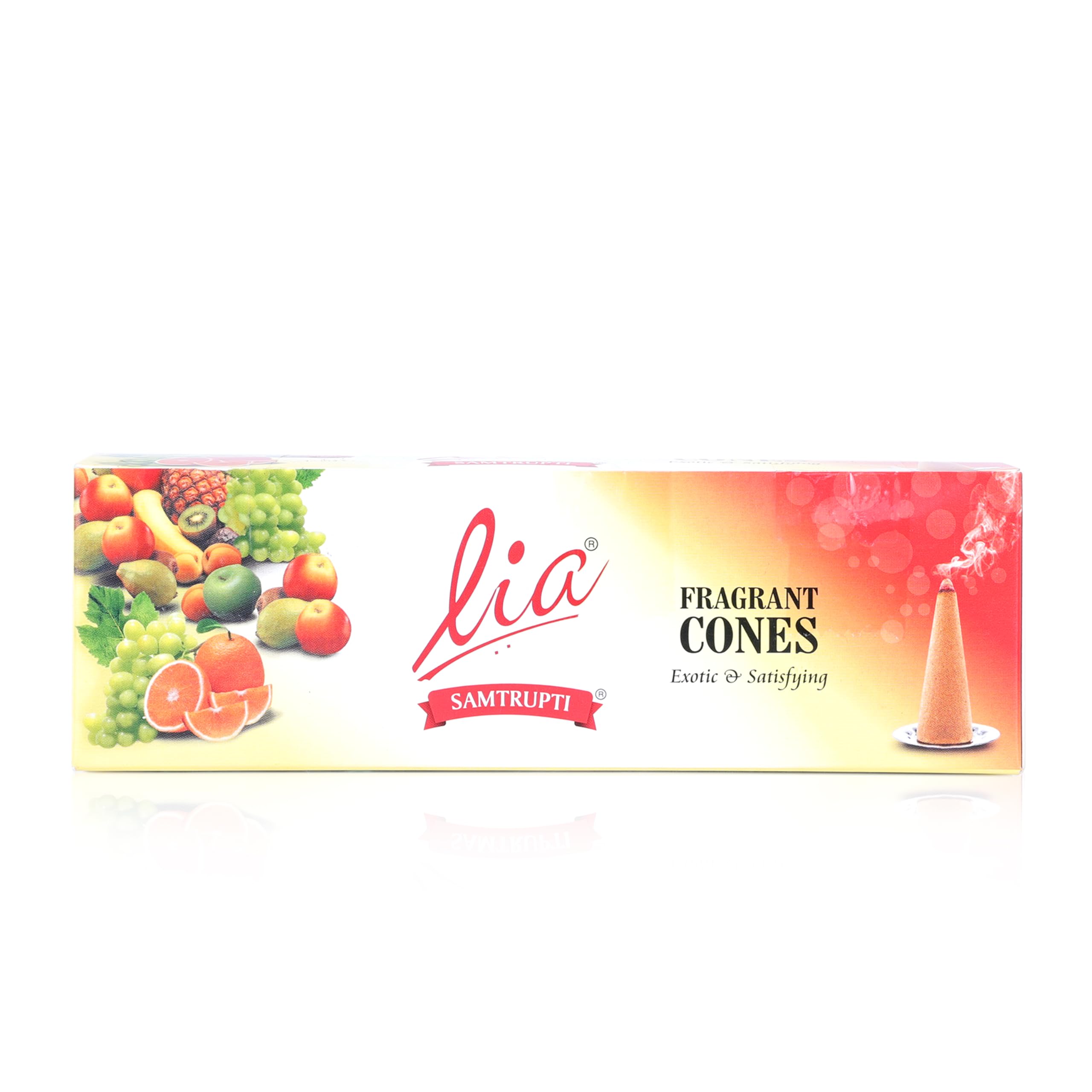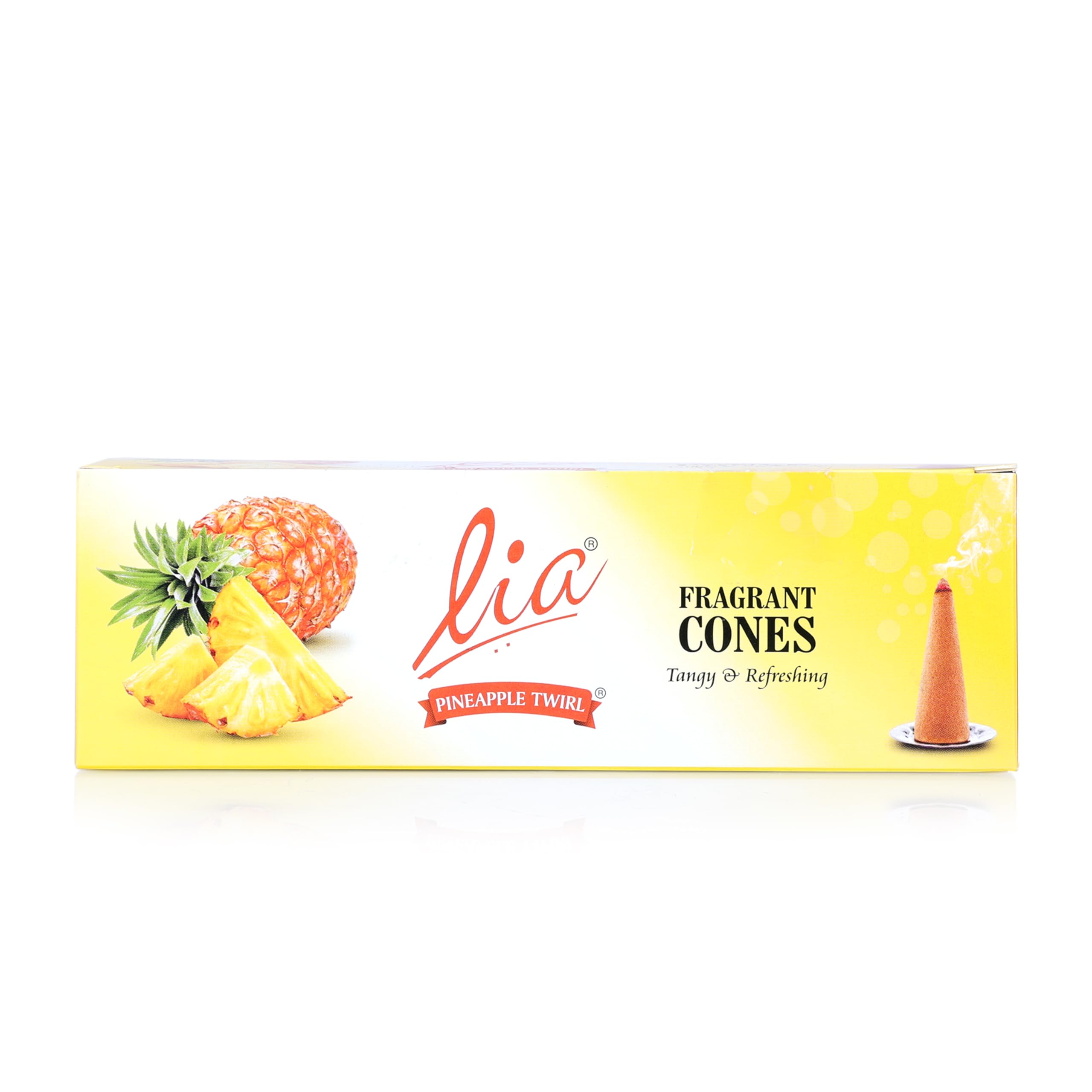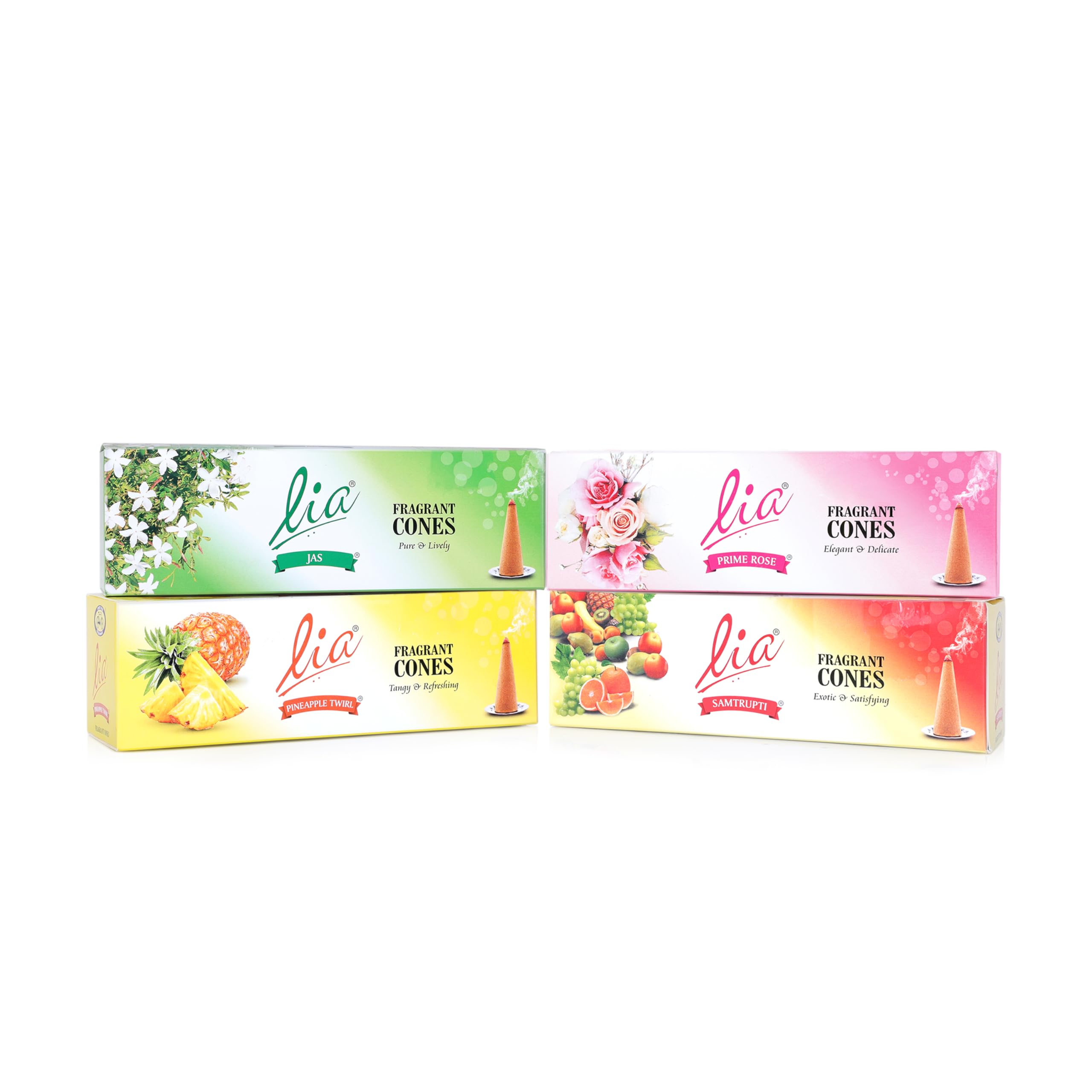 Cycle Pure Lia Fragrant Cones Combo Pack of 4 is an assortment of fruity and floral dhoop cones. They are 100% charcoal-free and crafted for puja meditation relaxation and yoga. Each cone burns approximately for 15 minutes. They are 100% charcoal free and are made for a quick fragrant diffusion. This pack contains 64 cones per fragrance - Lia Prime Rose (Rose) Lia Samtrupti (Fruity) Lia Pineapple Twirl (Pineapple) Lia Jas (Jasmine).