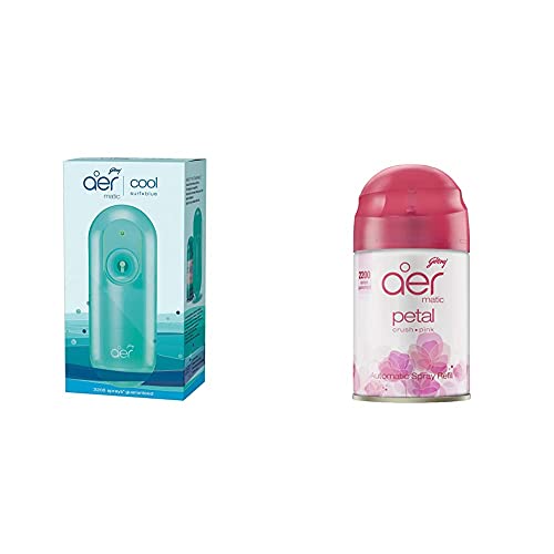 Godrej aer matic Automatic Air Freshener Refill Pack - Petal Crush Pink (225 ml)Petal Crush Pink Life is not a bed of roses. But it can smell like one right? Here's a fragrance that is as fresh as it is romantic. Godrej aer matic Presenting aer matic refill pack by Godrej - a range of four designer fragrances. By designer we mean they smell just as great as they look. Designed for a hassle free installation and easy replacement each refill pack guarantees 2200 sprays and lasts upto 60 days (under low settings). With it's killer looks Godrej aer matic - our automatic air fragrance diffuser is sure to adorn your interior spaces and works perfectly be it your living room bedroom or office spaces. It can easily be wall mounted with the provided mounting hole at the back or can be placed on a shelf with the inbuilt stand. All this with a flexi-control timer that sprays every 10 20 or 40 minutes allowing you to control fragrance intensity. The battery operated room freshener keeps your space fragrant 24x7 without any hassle. At the end of its cycle you just need to replace the air freshener refill unit with any of our 4 designer fragrances - Violet Valley Bloom Fresh Lush Green Petal Crush Pink and Cool Surf Blue.Godrej aer matic Automatic Air Freshener Kit with flexi control - Cool Surf Blue (225 ml)Cool Surf Blue A fragrance inspired by the smooth sea breeze flowing over coral reefs in Mauritius. It just can't get breezier than this. Godrej aer matic Presenting aer matic by Godrej - a range of automatic air fragrance diffusers available in four designer fragrances. By designer we mean they smell just as great as they look. All this with a flexi-control timer that sprays every 10 20 or 40 minutes allowing you to control fragrance intensity. With it's killer looks our automated air freshner is sure to adorn your interior spaces and works perfectly be it your living room bedroom or office spaces. It can easily be wall mounted with the provided mounting hole at the back or can be placed on a shelf with the inbuilt stand. Our battery operated room freshener keeps your space fragrant 24x7 without any hassle. And whats more each refill pack guarantees 2200 sprays and lasts upto 60 days (under low settings). At the end of its cycle you just need to replace the air freshener refill unit with any of our 4 designer fragrances- Violet Valley Bloom Fresh Lush Green Petal Crush Pink and Cool Surf Blue.