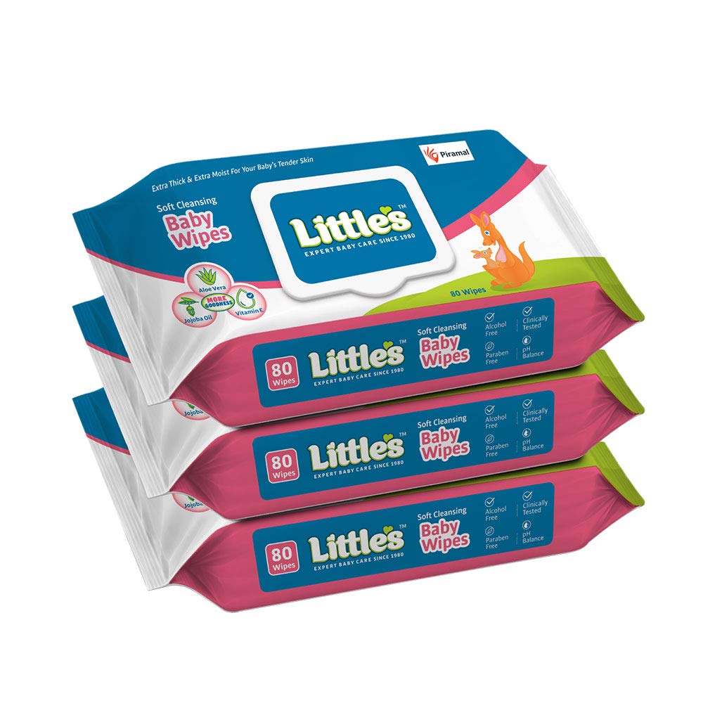 HomeBabyDiaperingBaby WipesLittle's Soft Cleansing Baby Wipes with Lid | 80 Wipes x Pack of 3 - 240 Wipes | Extra Thick & Moist Wet Wipes for Baby's | Prevents Rashes & Redness with Goodness of Aloe Vera, Vitamin E & Jojoba Oil