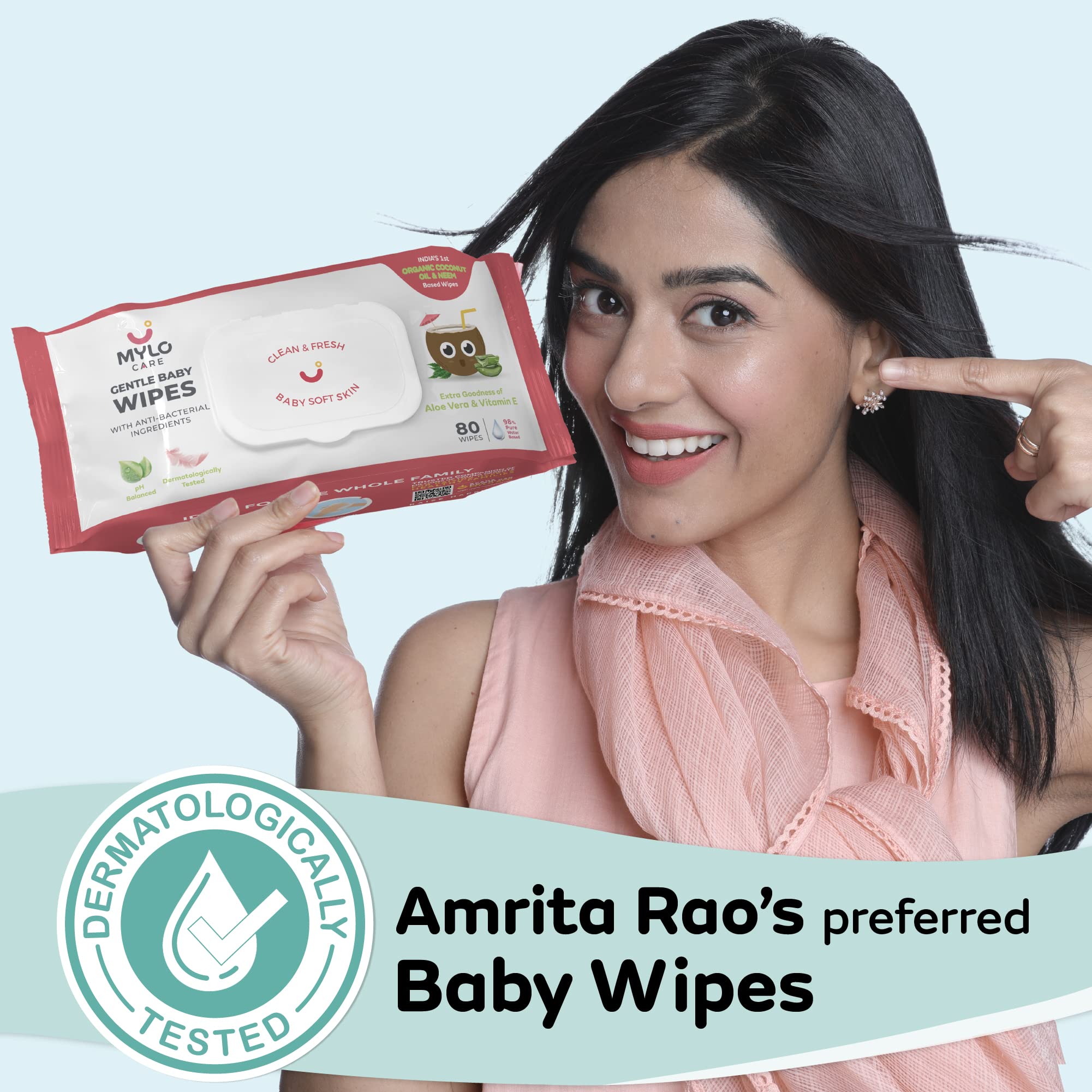 HomeBabyDiaperingBaby WipesMylo Care Gentle Baby Wipes (With Lid - Pack of 3), Soft Cleansing Baby Wipes with 98% Pure Water, Organic Coconut Oil & Neem (80 wipes x 3 packs) | Ideal For Your Baby's Daily Skin Care Routine | Free from Parabens and Soap