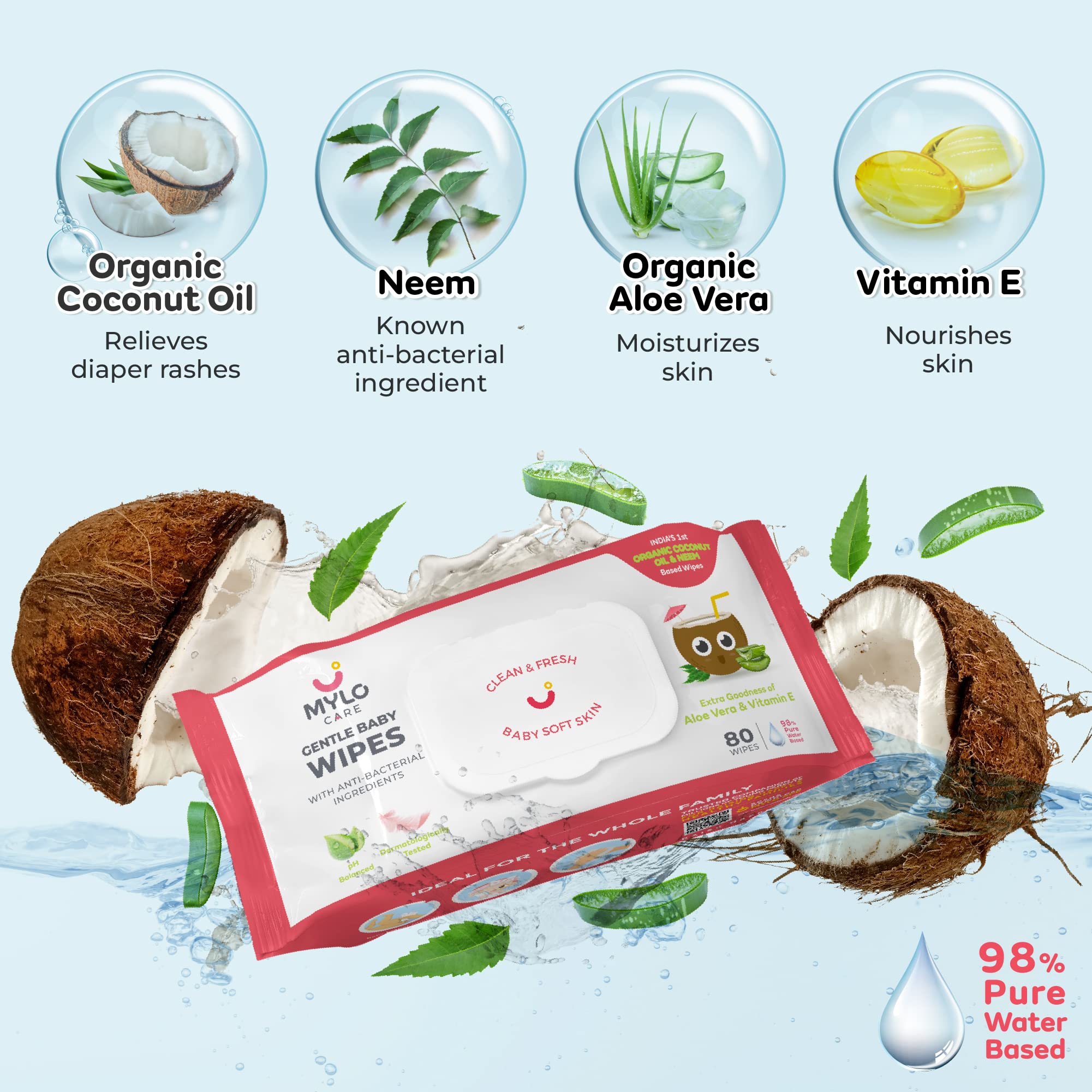 Mylo Care Gentle New Born Wet Wipes with Organic Coconut Oil Organic Aloe Vera & Neem Mild Soothing Fragrance Wipes with Lid (80 wipes x 3 packs)