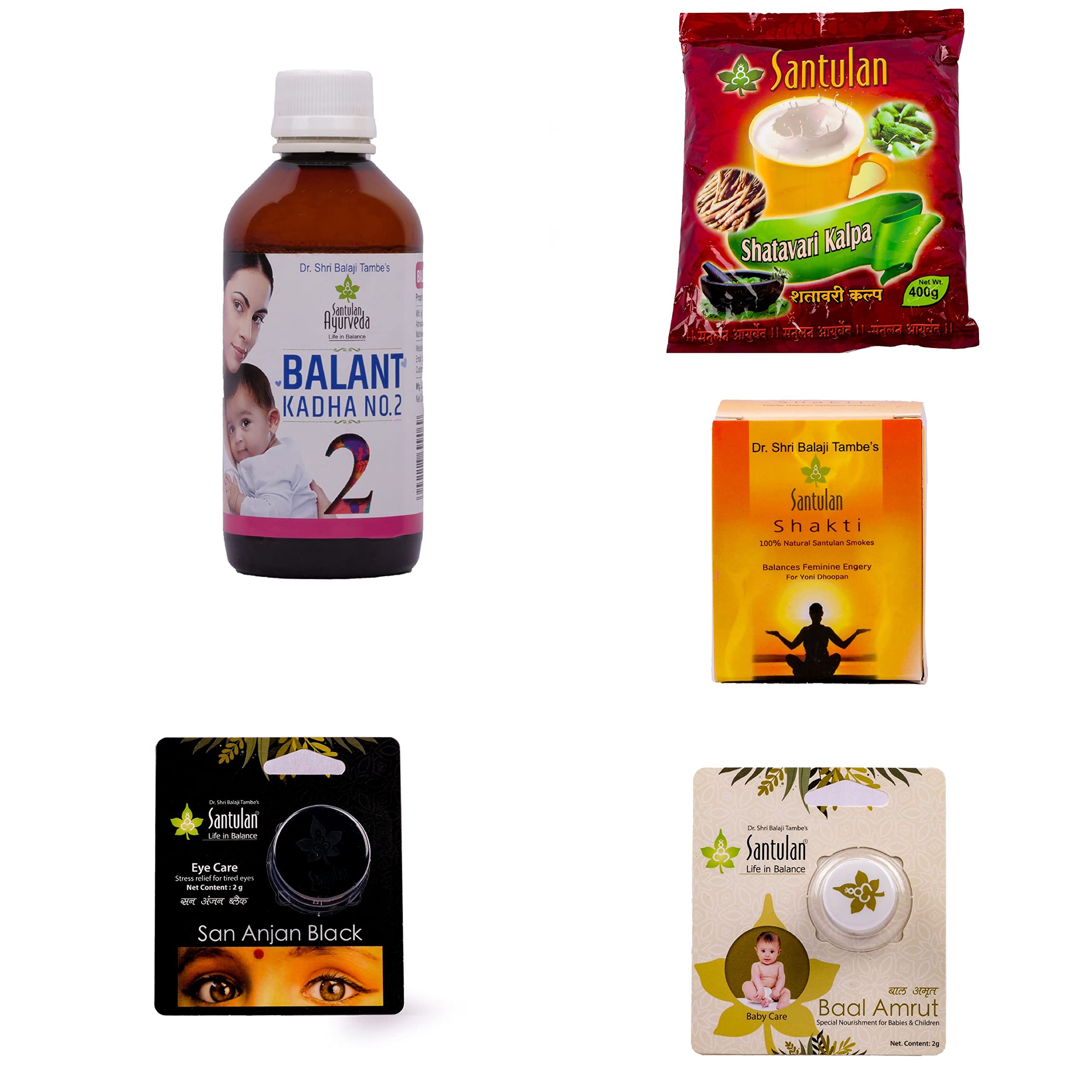 HomeHealth & PersonalPersonal CareBaby & Child CareSantulan Ayurveda Balant Kadha No 2-200ML and Combo Pack Of Shatavari Kalpa-400GM Shakti Dhoop-20GM San Anjan Black-2GM Baal Amrut-2GM Care Combo and get Golden Oldie HerbsSukanthi Pills-1gm