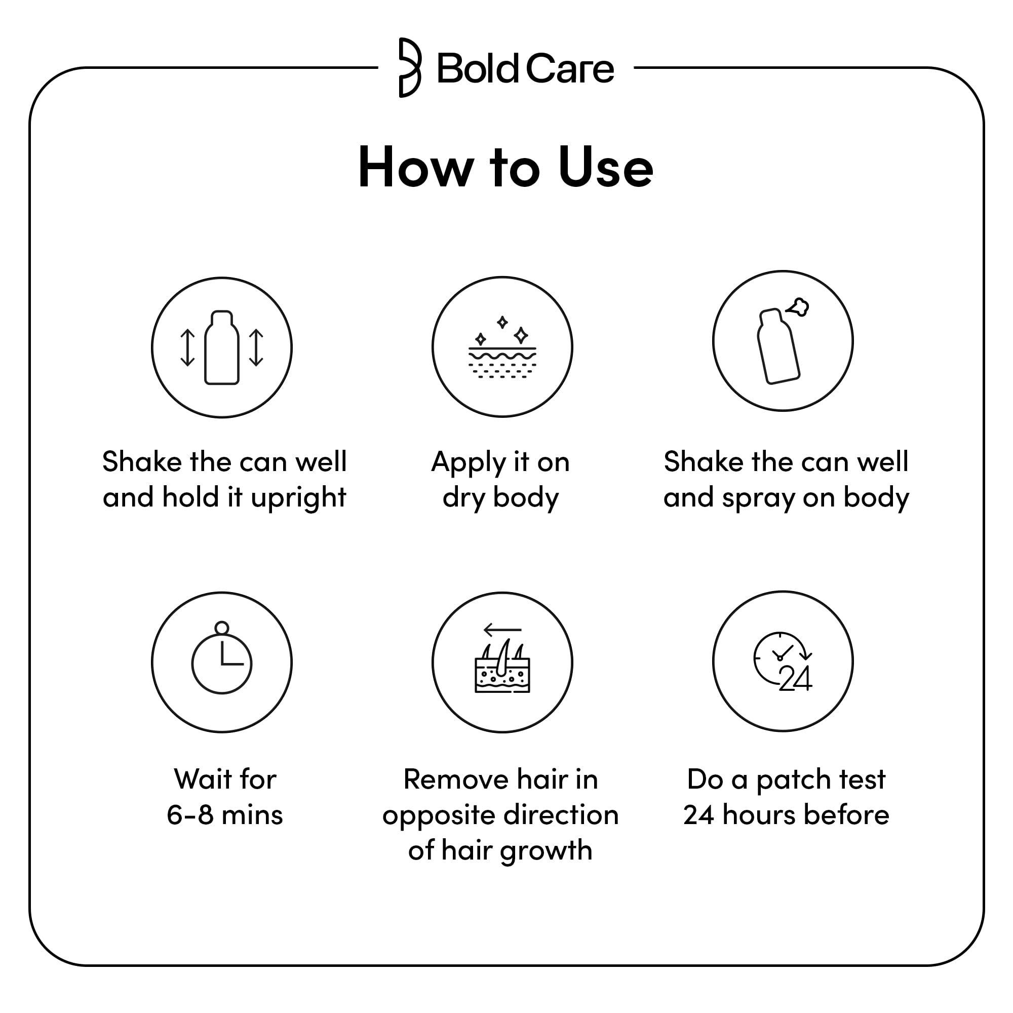 with Bold Care Hair Removal Spray removing unwanted body hair has never been easier. Simply spray the fine mist onto the desired area wait a few minutes and wipe away hair effortlessly. No need for razors wax strips or messy creams.