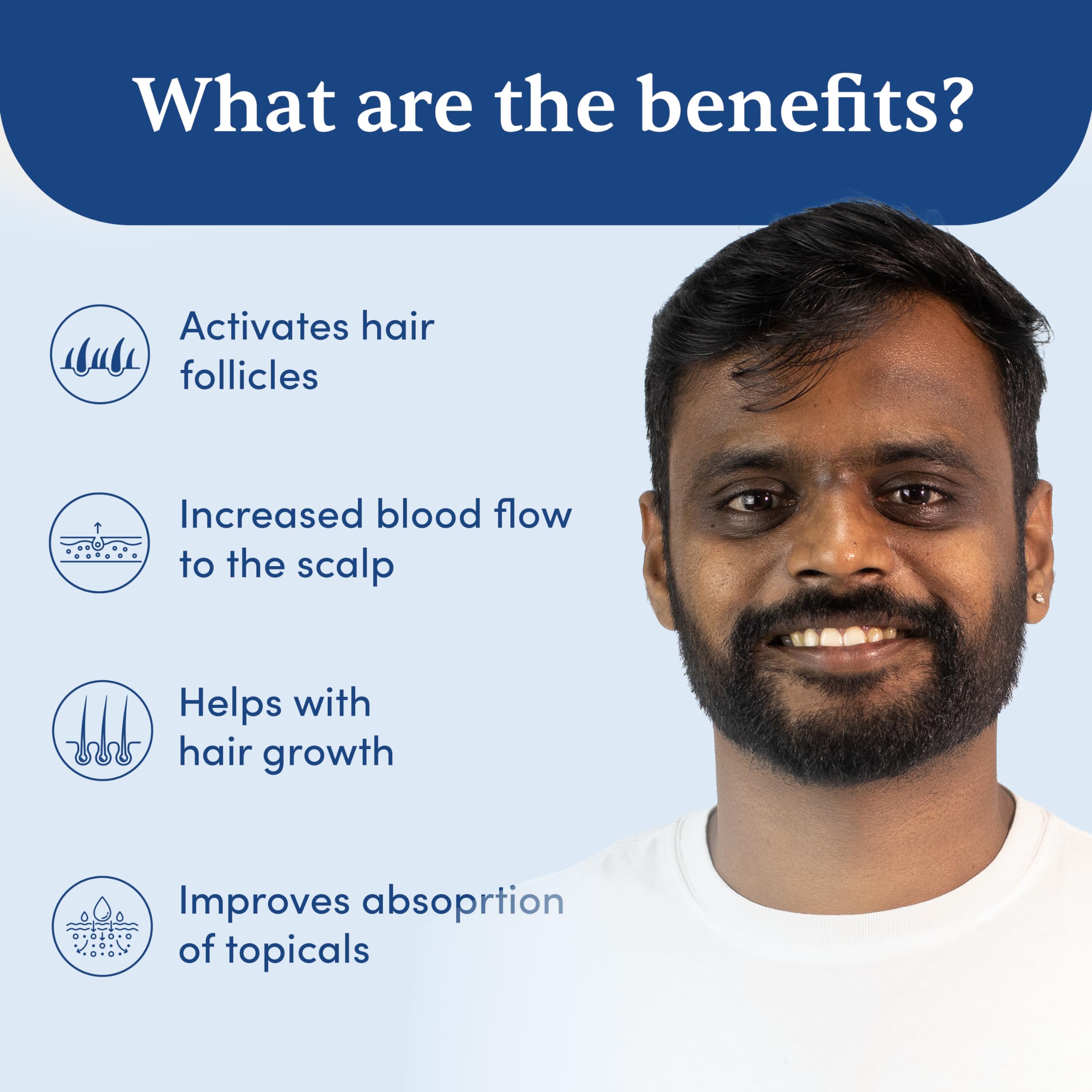 • Beard & Hair growth: The micro-needling process of the derma roller creates small punctures in the skin and helps stimulate hair follicles thus improving the absorption of topical applicators