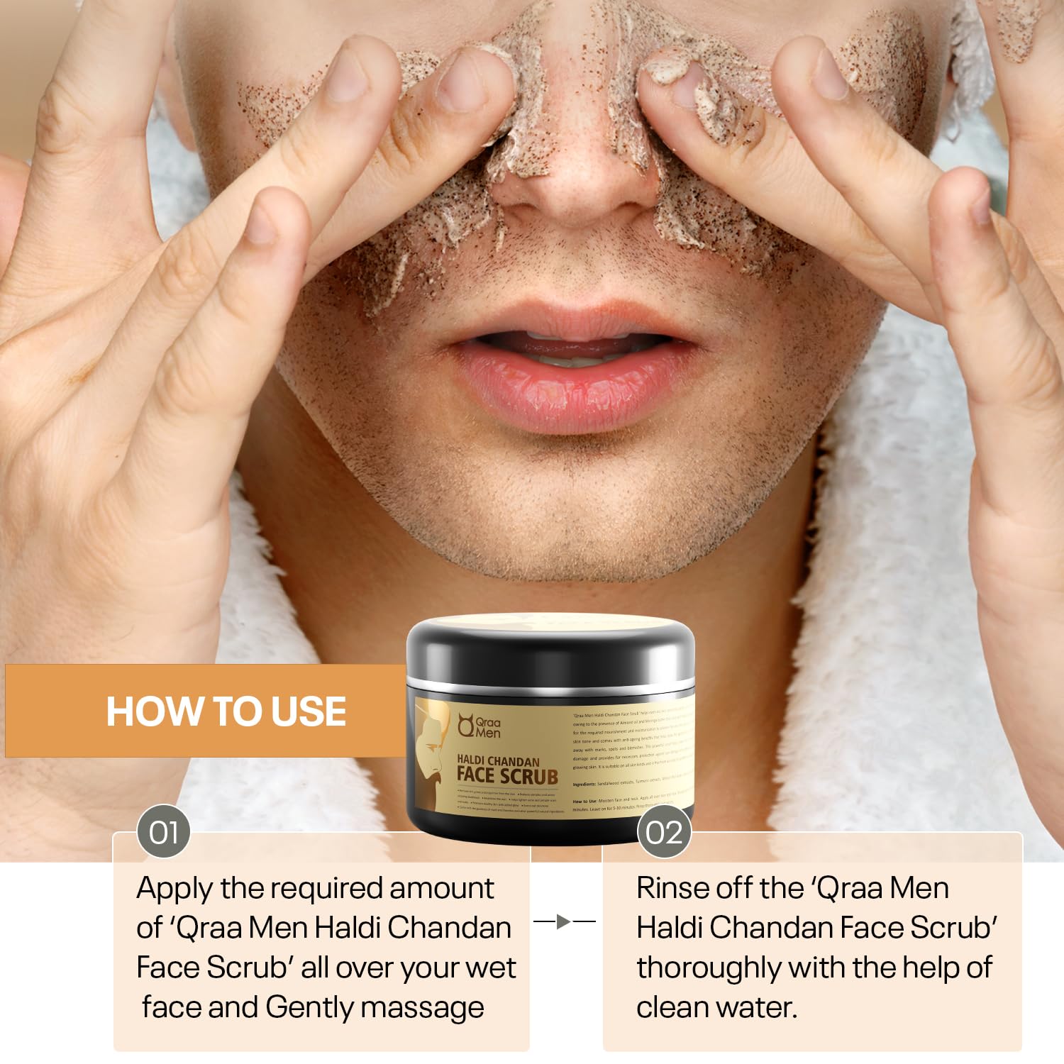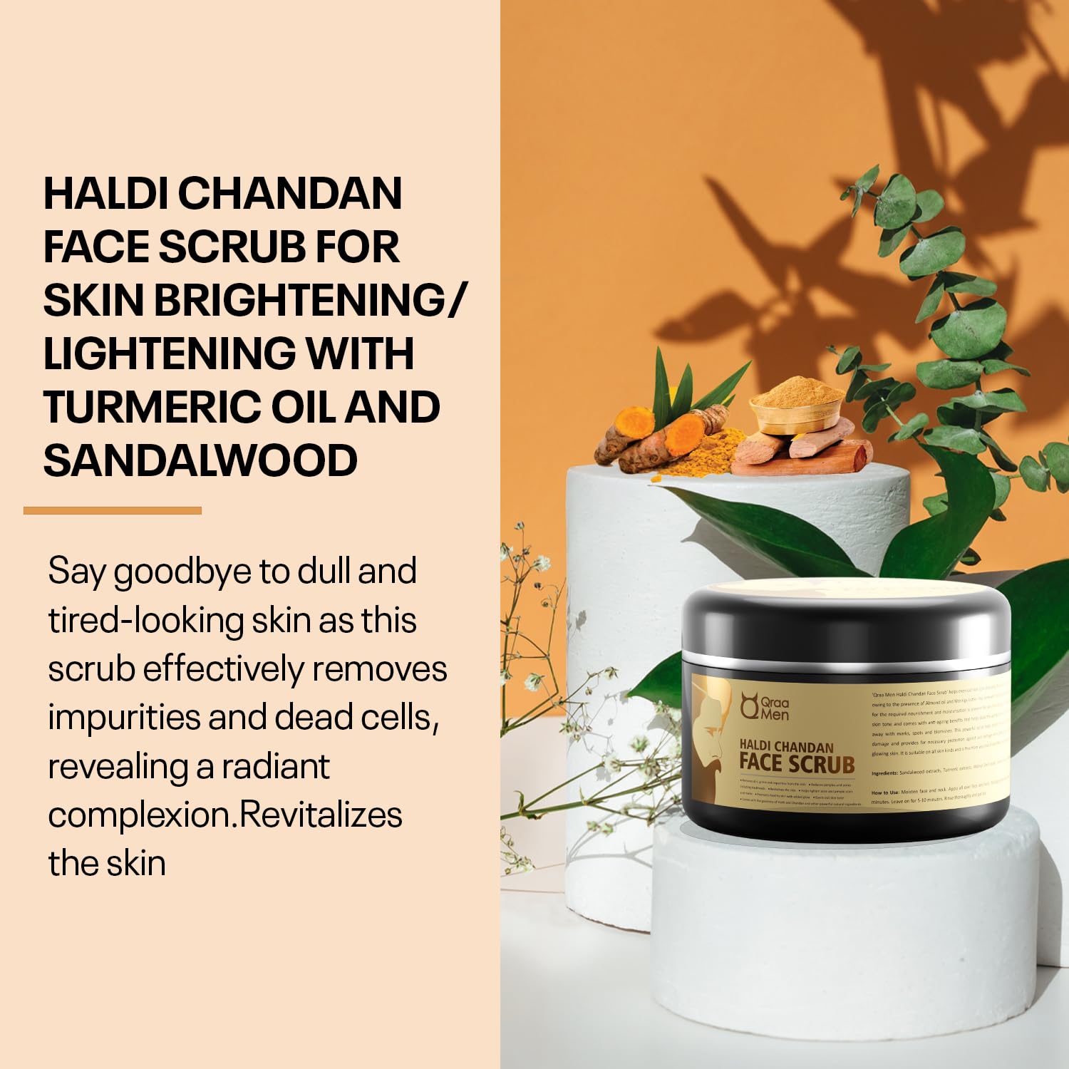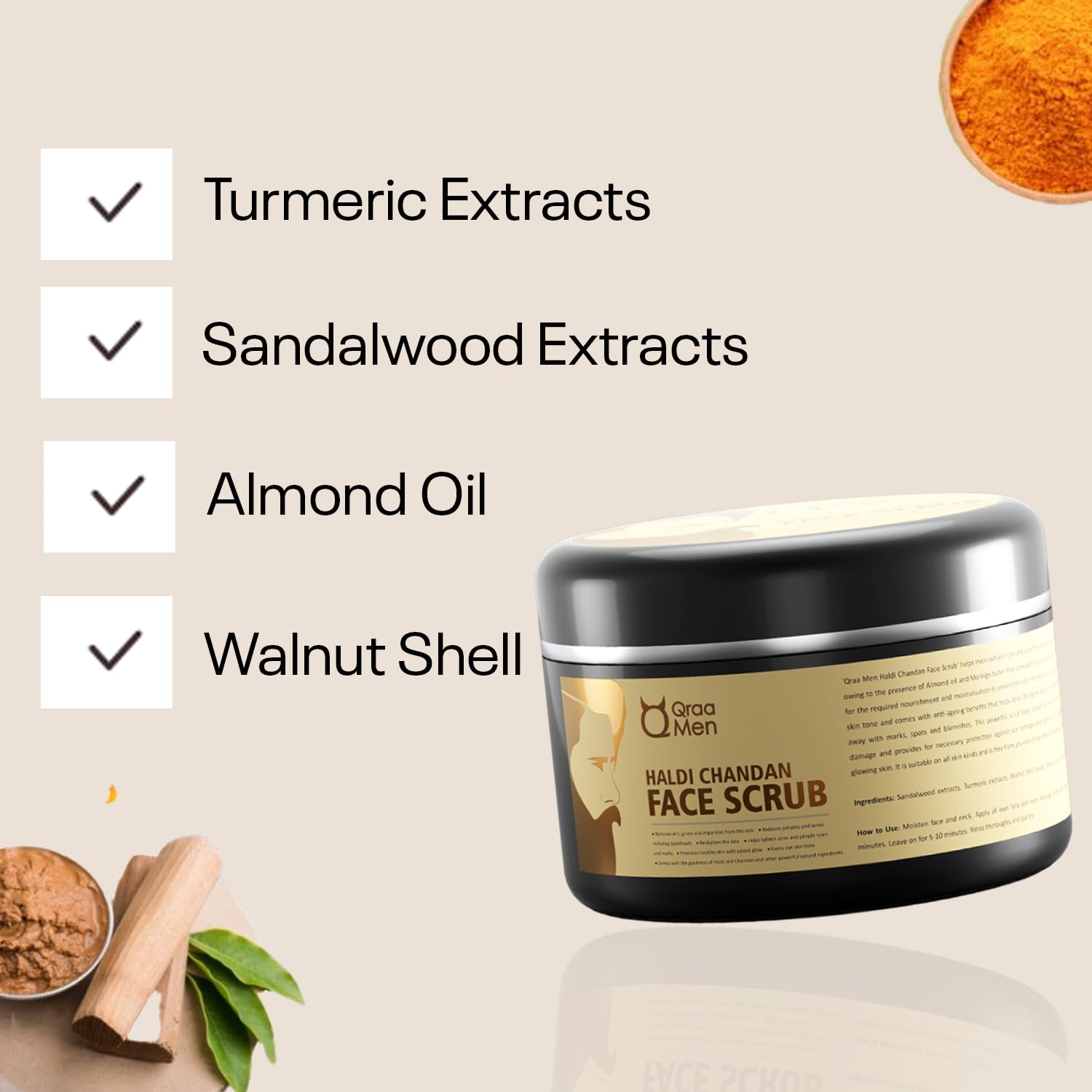 Experience the best of skin exfoliation with the super beneficial Qraa men haldi chandan face scrubâ. enriched with the goodness of natural ingredients like sandalwood extracts turmeric extracts walnut shell beads almond oil and moringa butter etc. Using this powerful scrub not only helps cleanse the skin in a deep way but it helps do away with dead skin impurities dirt and dust in an all round manner and in ition helps do away with blackheads effectively. It s pimples acnes and other breakouts and in the endeavour helps lighten stubborn acne and pimple marks spots and blemishes. The beneficial goodness of components helps to the health and texture of the skin that helps hethe skin while revitalising it from the core. Therefore using this scrub can get you a healthier skin with that of ed glow.