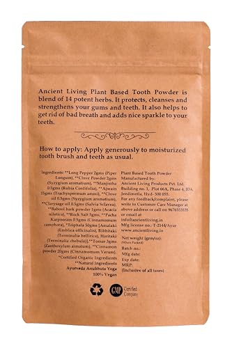 Ancient Living Organic tooth powder which is derived from the heart of Ayurveda is a boon to your oral health care. The carefully selected ingredients deliver a fresh breath and improve your gum health with every use. This organic tooth powder can replace your toothpaste as it consists of potent ingredients. It has natural teeth whitening products such as clove long pepper babool bark and cinnamon which are historically known to freshen the breath. While these ingredients are busy ensuring your gum health rock salt adds a nice sparkle to your teeth. This herbal tooth and gum powder act as a natural toothpaste for sensitive teeth. It is an invaluable tooth powder as it gets rids of bad breath and takes care of your overall oral health. It can be used by all the members of your family. Method of Usage: Wet your mouth take the desired quantity and gently massage your teeth with the powder. A slight tingling sensation will be noticed due to the presence of clove and pepper essential oils. Rinse with water. Repeat if necessary. This powder is non-foaming. It is made with freshly ground ingredients from our farms and is free of any fillers foaming agents or preservatives.