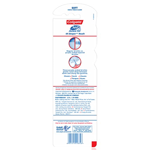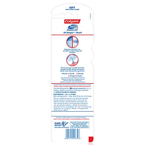 Colgate 360° Floss-Tip Toothbrush comes with a unique floss-tip bristle design for deep cleaning and gentle action. It provides 4x deeper reach to clean mouth thoroughly. The brush is designed to clean parts of the mouth other flat trim brushes can miss. The special purple-ended tapered bristles provide a deep clean action on both sides of the teeth and along the gumline while the cheek & tongue cleaner works to clean more than just teeth. Easy-to-hold brush handle ensure to give comfortable grip during brushing. The toothbrush cleans your whole mouth including teeth tongue cheeks & gums to give you a healthier whole mouth clean.