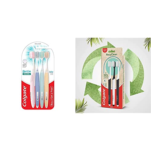 Colgate Gentle Enamel Ultra Soft Bristles Toothbrush 4 Pcs (Buy2 Get 2) Soft Bristles for Enamel CareColgate Introduces Its New Range Of Ultra-Soft Toothbrushes  Colgate Gentle. This Range Has Been Specially Designed With Dentists To Offer The Gentlest Care For Your Teeth And Is Endorsed By The Indian Dental Association. Tooth Enamel Is The Hardest Substance In The Human Body. It Protects Our Teeth From Decay Wear And Acidic Substances. Once Your Tooth Enamel Is Damaged It Cannot Be Replaced. Therefore Using A Toothbrush Which Is Gentle On Your Teeth Is Important To Protect Enamel. Colgate Gentle Enamel Toothbrush Is A Super-Soft Toothbrush With 150% More Soft Slim Tip Bristles Which Wrap Around Teeth Enabling Complete Gentle Protection. Made Especially For Sensitive Teeth Colgate Gentle Enamel Care Toothbrush Comes With Dual Bristle Technology To Better Fit And Clean Your Tooth Surface. The Outer Layer Is Softer For Comfortable Protection While The Inner Layer Is Firmer For Better Cleaning. The Wide Brush Head Provides Greater Coverage Has 6X Deeper Reach And The Flexible Neck Reduces Pressure On Your Gums. Experience The Gentlest And Superior Care With Colgate Gentle Enamel ToothbrushesColgate RecyClean Toothbrush Planet Friendly Recycled 3 PcsNow the Earth will smile every time you smile. With the Colgate RecyClean Soft Toothbrush made from recycled plastic. The handle of this toothbrush is comfortable and comes with a skidproof thumb grip. It is made of plant-based bristles which are BPA free. The compact head is designed for a better reach with a power tip trim for deep cleaning. The toothbrush comes in recycled packaging too. Do your bit for the environment with the Colgate RecyClean Soft Toothbrush