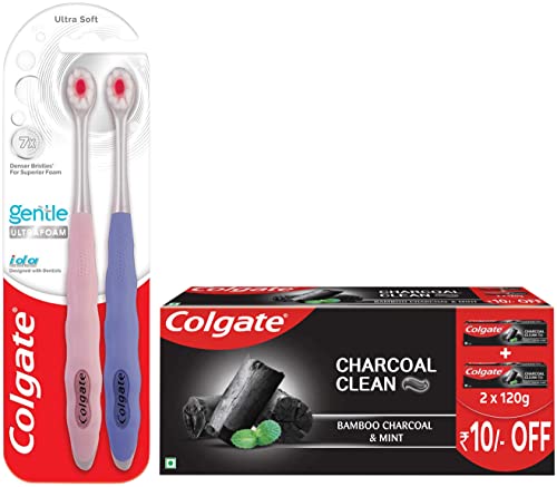 Colgate Gentle UltraFoam Ultra Soft Bristles Manual Toothbrush for adults 2 Pcs Soft Bristles for Superior Clean MulticolorToothbrushColgate Charcoal Clean Black Gel Toothpaste Pack of 240g (120g X 2) Deep Clean Colgate Toothpaste With Bamboo Charcoal & Wintergreen Mint For Plaque Removal Tingling Fresh Mouth ExperienceBid farewell to your usual brushing experience and say hello to an interesting one with Colgate Charcoal Clean black gel toothpaste. Refresh your senses with a  toothpaste which is perfect blend of natural bamboo charcoal that helps to detoxify for a deep clean feeling & exotic Wintergreen mint with its subtle tingling and long-lasting freshness. It is a gel-based paste that is effective in removing plaque & bad breath-causing bacteria.  Not just an interesting color but also an interesting minty taste with benefits. It is an anticavity toothpaste providing freshness and whitening on regular use
