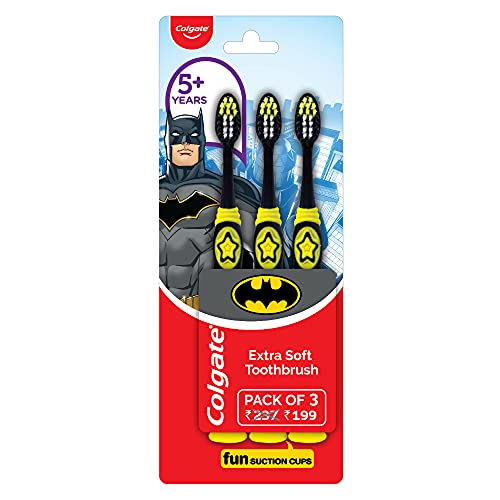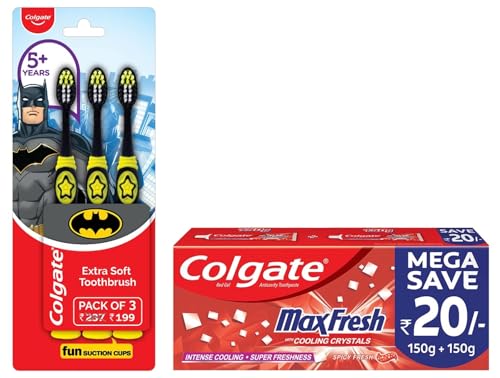Colgate Kids Batman Manual Toothbrush Extra-soft Bristles and Built-in Tongue Cleaner Compact Head and Non-Slip Handle (Pack of 3Multicolor)Kids must brush their teeth at least 2 times a day and Colgate Kids Batman Toothbrush is a fun way to encourage good oral care habits early on! This attractive extra-soft bristle toothbrush has extra soft bristles especially designed for children. It is ideal for kids of age 5 years and above who have baby teeth or developing permanent teeth. Extra soft multi-height bristles on the toothbrush effectively clean big and small teeth while the raised tip helps clean hard to reach back teeth. The kid's toothbrush features a well-rounded handle; a thumb grip offering comfortable hold; a suction cup at the base for easy and fun upright storage and a soft plus safe tongue cleaner on the back of the toothbrush head. Cleaning teeth could never have been more fun! Developed with the help and expertise of Pediatric dentists Colgate offers a healthy and thorough clean. The toothbrush helps clean beyond teeth so your kid's smile only gets brighter and cleaner.Colgate MaxFresh 300g (150g x 2 Pack of 2) Anticavity Toothpaste Gel Spicy Fresh (Saver Pack)Switch on the power of freshness with Colgate Maxfresh toothpaste that refreshes you and helps you seize the day because every morning is a fresh start. The red gel toothpaste contains unique cooling cyrstals that give you an intense cooling while you brush. Recommended Usage: Put a pea size amount of our Colgate toothpaste on the head of the toothbrush. Insert the toothbrush into your mouth & use gentle short strokes to brush your teeth. For a better experience try with Colgate Gentle Enamel Toothbrush. For optimal results brush twice daily for 2min. Colgate is India's most trusted oral care brand. As a trusted partner we are committed to doing business with integrity and respect for all people and the world around you. Colgate offers quality oral care products including toothpastes and toothbrushesas well as expert dental health information. Colgate toothpastes are always 100% vegetarian and gluten free. We care about our environment Colgate India is the nation's first to earn True Zero Waste Platinum certification for all its four manufacturing sites in India from Green Business Certification Inc. (GBCI). This toothpaste is made in India with highest quality standards.