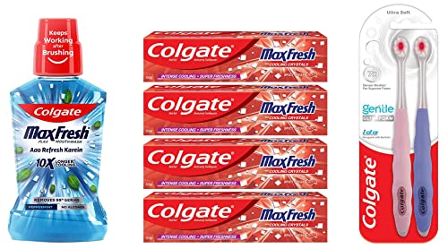 Colgate Max Fresh Bad Breath Treatment Toothpaste Red Gel Paste With Menthol For Super Fresh Breath 600g 150g X 4 Spicy FreshRefresh with Colgate Maxfresh toothpaste and seize your day because every day is a fresh start. The red gel toothpaste contains unique cooling crystals that give you an intense cooling while you brush and helps get rid of bad breath. Colgate is India's most trusted oral care brand. As a trusted partner we are committed to doing business with integrity and respect for all people and the world around you. Colgate offers quality oral care products including toothpastes and toothbrushesas well as expert dental health information. This toothpaste is 100% vegan and gluten free. We care about our environment Colgate India is the nation's first to earn True Zero Waste Platinum certification for all its four manufacturing sites in India from Green Business Certification Inc. (GBCI). This toothpaste is made in India with highest quality standards.Colgate Gentle UltraFoam Ultra Soft Bristles Manual Toothbrush for adults 2 Pcs Soft Bristles for Superior Clean MulticolorToothbrushColgate Plax Pepper Mint Mouthwash 0% Alcohol - 500 mlColgate Plax Peppermint Fresh mouthwash removes over 99% of germs that cause bad breath and cavities giving you a fresher and cleaner mouth than brushing alone. It has an extra refreshing peppermint flavour.This mouthwash contains no alcohol (non-alcoholic) hence does not cause any burning sensation when you use it. Yet it removes 99% germs instantly. You will experience an instant blast of freshness and 10X longer cooling sensation compared to brushing alone. This mouthwash gives you 24/7 control over bad breath with regular use. How to use: Fill the cap to its line (20ml). Rinse mouth with mouth wash thoroughly for 30 seconds gargle and expel. Do not swallow. This mouth wash can be used by both men and women When to use: After brushing An effective mouth freshner for your post meal needs. Colgate is India's most trusted oral care brand. As a trusted partner we are committed to doing business with integrity and respect for all people and the world around you. Colgate offers quality oral care products including toothpastes and toothbrushesas well as expert dental health information.