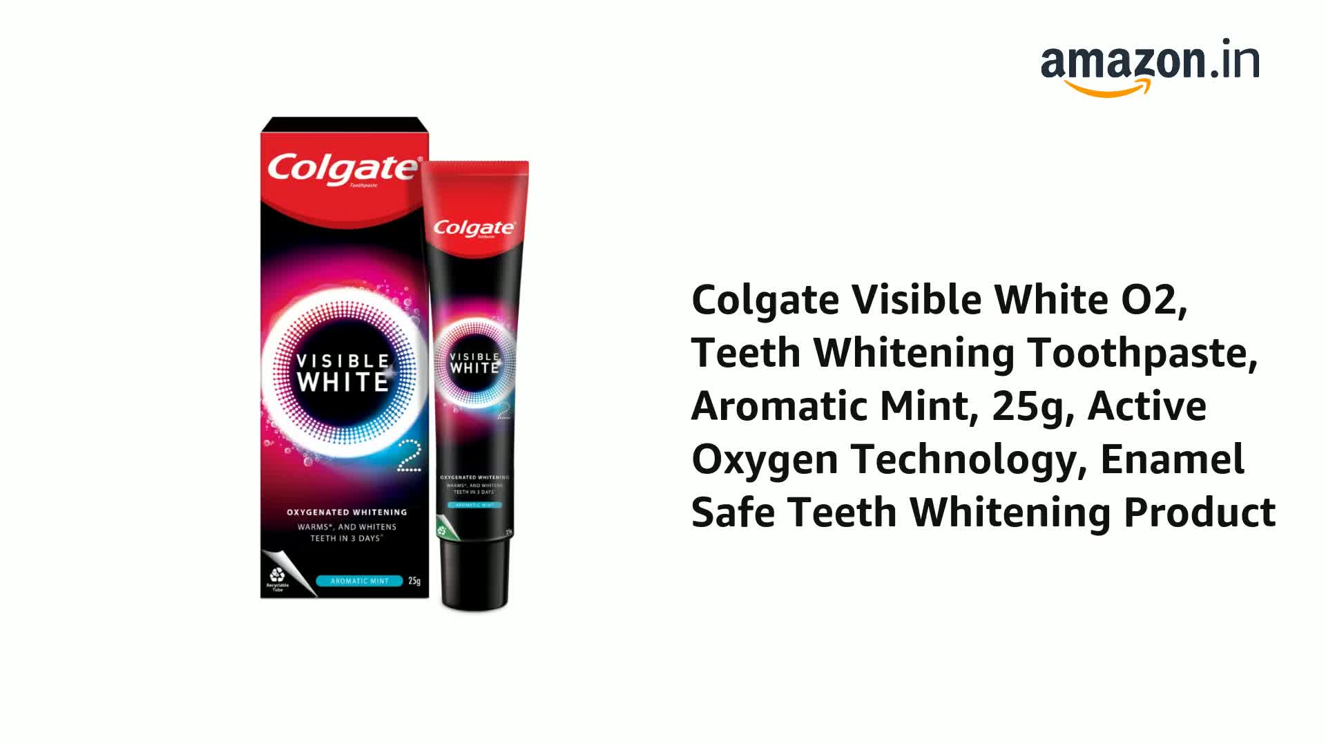 • NOTICEABLY WHITER TEETH in 3 DAYS: Colgate Visible White O2's Active Oxygen technology starts whitening your teeth in 3 days and offers you noticeably whiter teeth than ever before when used as directed on the pack.