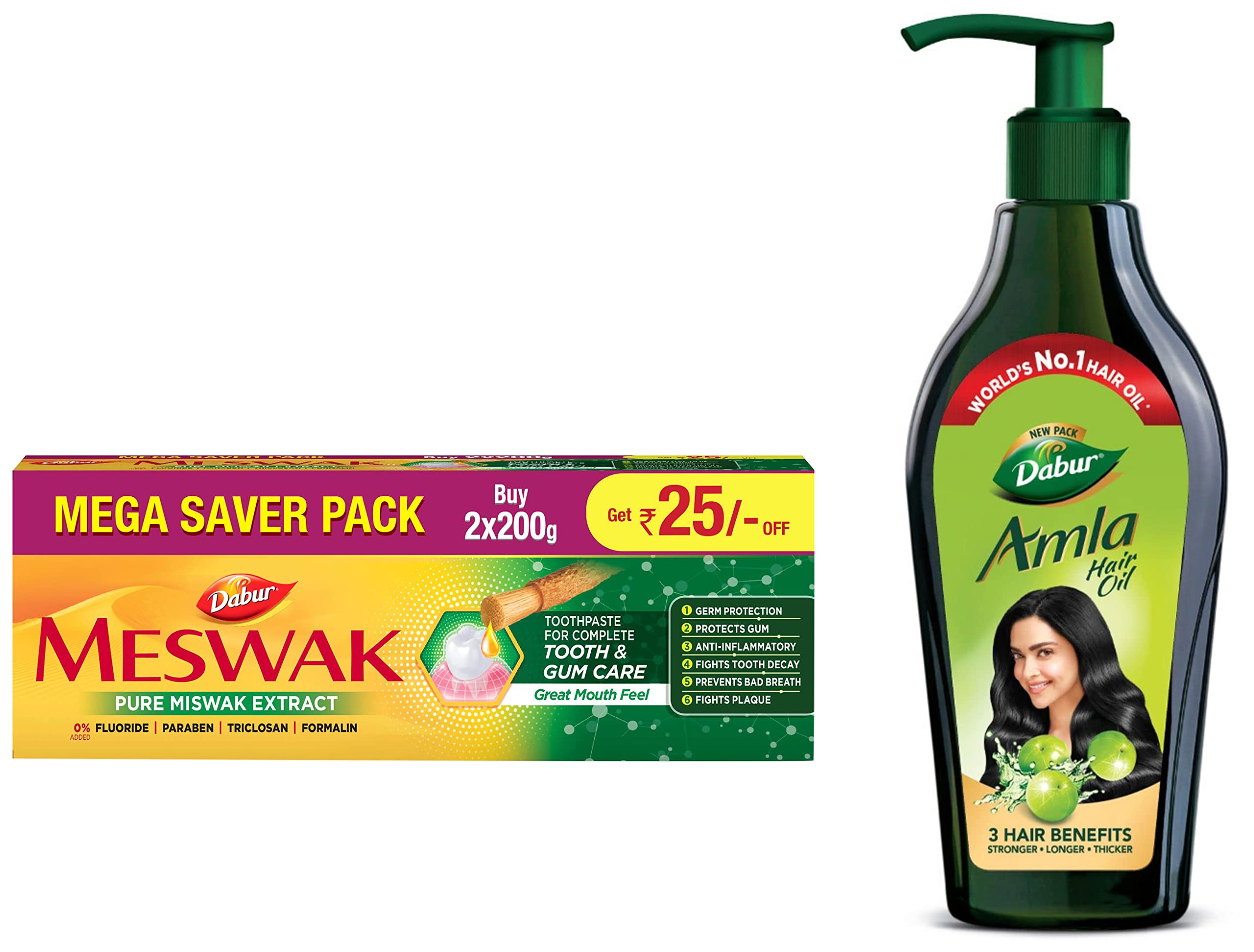 Dabur Meswak Complete Oral Care Toothpaste with Tooth Decay Prevention Stain Removal Cavity Protection Tartar Control Gum Protection Plaque Removal Anti-Bacterial - 400gm (200 gm*2)If you want to start your day with something that is truly unique go grab a pack of Dabur Meswak today. Dabur Meswak is made from pure extract of rare Miswak herb which grows slowly resisting the brutal forces of nature amidst the sand dunes of Africa and South Asia. Even a small portion of this herb is capable of providing Complete Oral Care to you. The ingredients of Miswak herb truly make Dabur Meswak unique. It has Resins which form a layer over the enamel - protecting against caries; Silica which removes stains; Alkaloids exerts a bactericidal effect and stimulatory action on gingival Essential oils stimulates the flow of saliva ehich works as an antiseptic Vitamin C helps in healing and repair of tissues etc. The best part of this unique toothpaste is the amazing mouthfeel it leaves behind which lasts the whole day.Dabur Amla Hair Oil - for Strong Long and Thick hair - 550 mlDabur Amla Hair Oil infuses your hair with strength thanks to Amla extract which is renowned as the power fruit for hair which has been traditionally used as a hair tonic.It is a beneficial product for scalp health . Dabur Amla hair oil penetrates well into your scalp nourishes your scalp & hair with the power of Amla. Dabur Amla helps make your hair strong from the roots and also helps in hair growth to give stronger longer & thicker hair. Now Strengthen your hair from roots to tips!