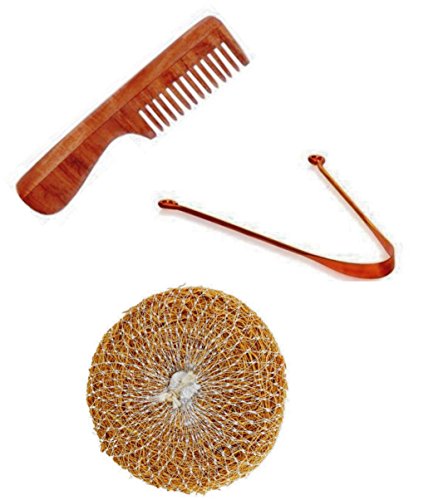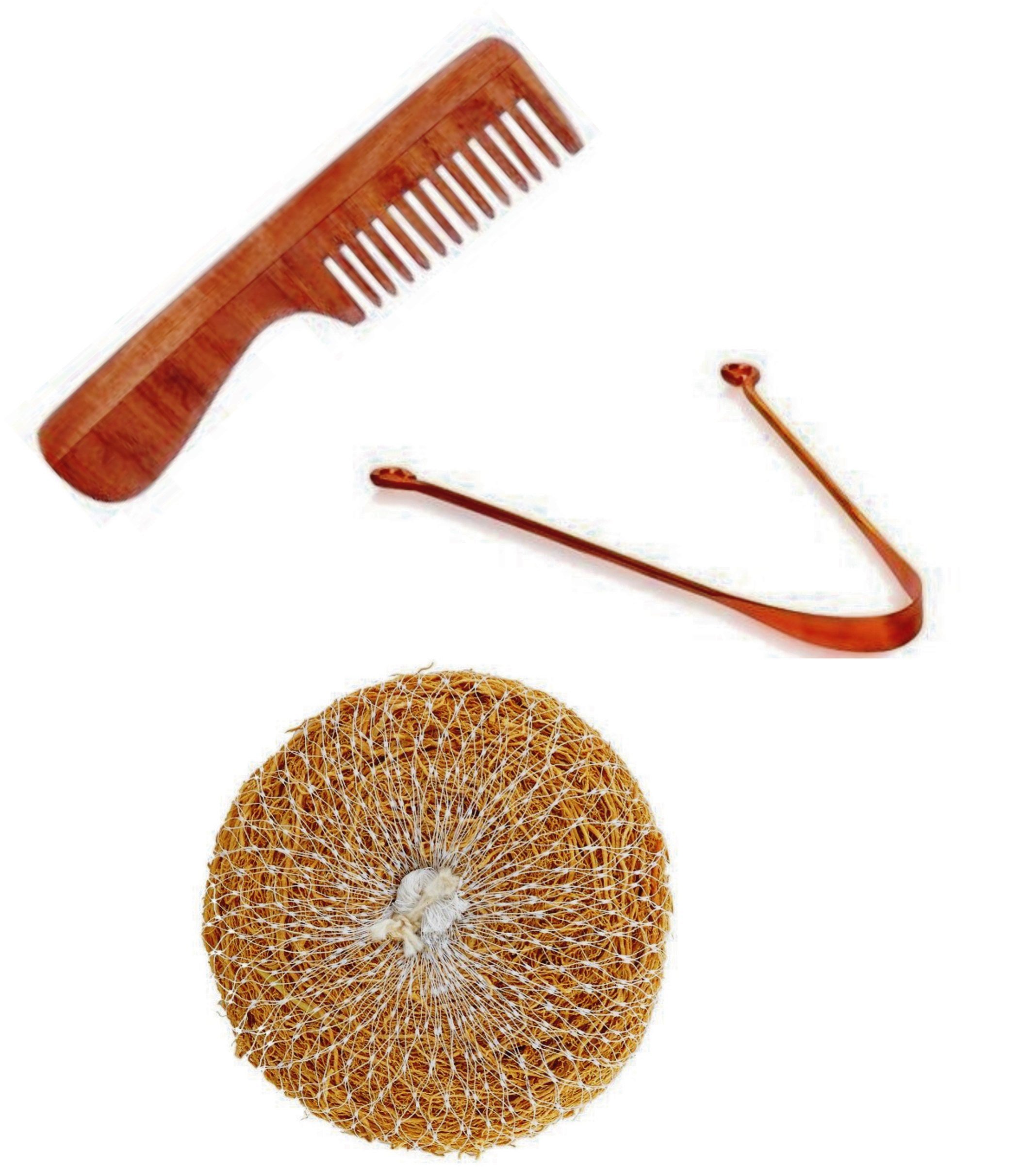 Devodhyog proudly presents a combo of Pure Neem Wood Comb Pure Copper tongue Cleaner and Khus (vettiver) body scrub . These are Indian traditional and natural Products being used since ages .