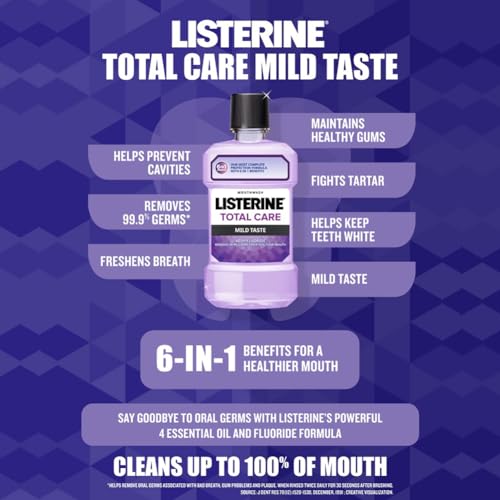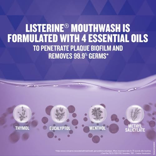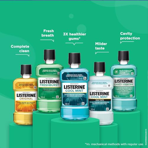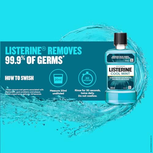 We brush our teeth everyday but brusing cleans only our teeth. Other parts of the mouth like tongue gums palette (roof of the mouth) and inner side of the cheeks may not get cleaned. This may lead to germ build up in the mouth which causes various oral problems like bad breath bleeding gums and cavities. Rinsing everyday with Listerine removes 99.9% germs from your mouth as it can reach every corner of your mouth. Our patented powerful essential oil formula (Menthol Thymol Eucalpytol Oil of Wintergreen) provides upto 24 hour protection against germs causing bad breath gum problems and plaque. For best results rinse with undiluted 20ml twice a day for 30 seconds. Don't worry if you can't get to 30 seconds the first time it gets easier with each try. Now get whole mouth clean with Listerine!