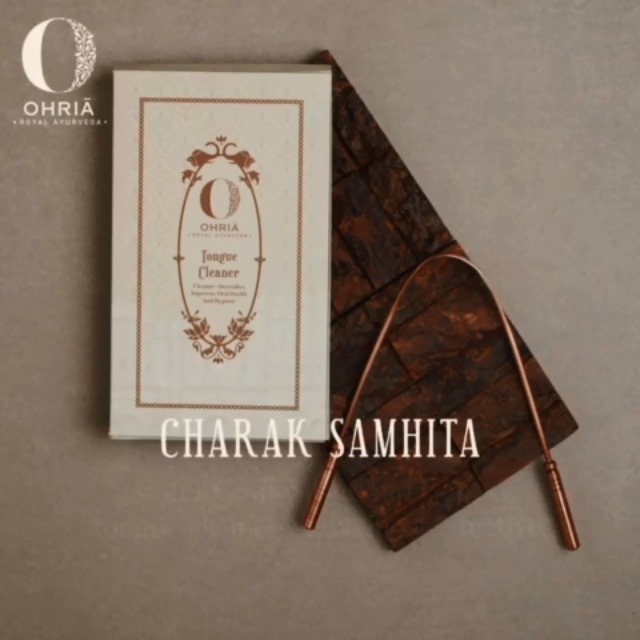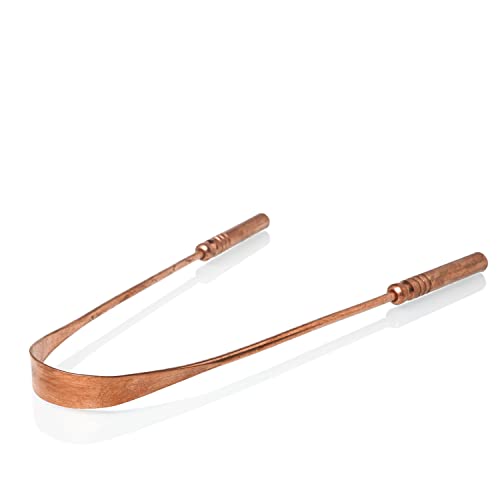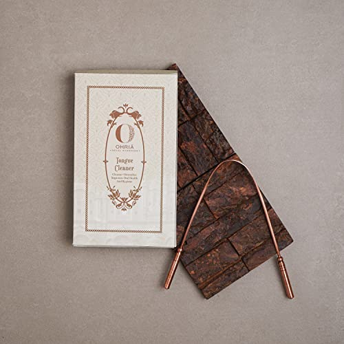 Ohria's Pure Copper Tongue Cleaner to improve oral health by scraping the tongue. Effectively removes toxins (ama) accumulated in the mouth reducing bad breath and bacterial load. Ayurveda recommends copper for tongue scraping due to its antibacterial property. Regular usage improves overall health by reducing plaque tooth decay & gum diseases improving the tongue's appearance & sense of taste.