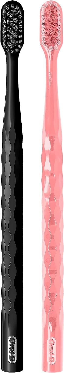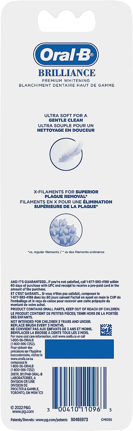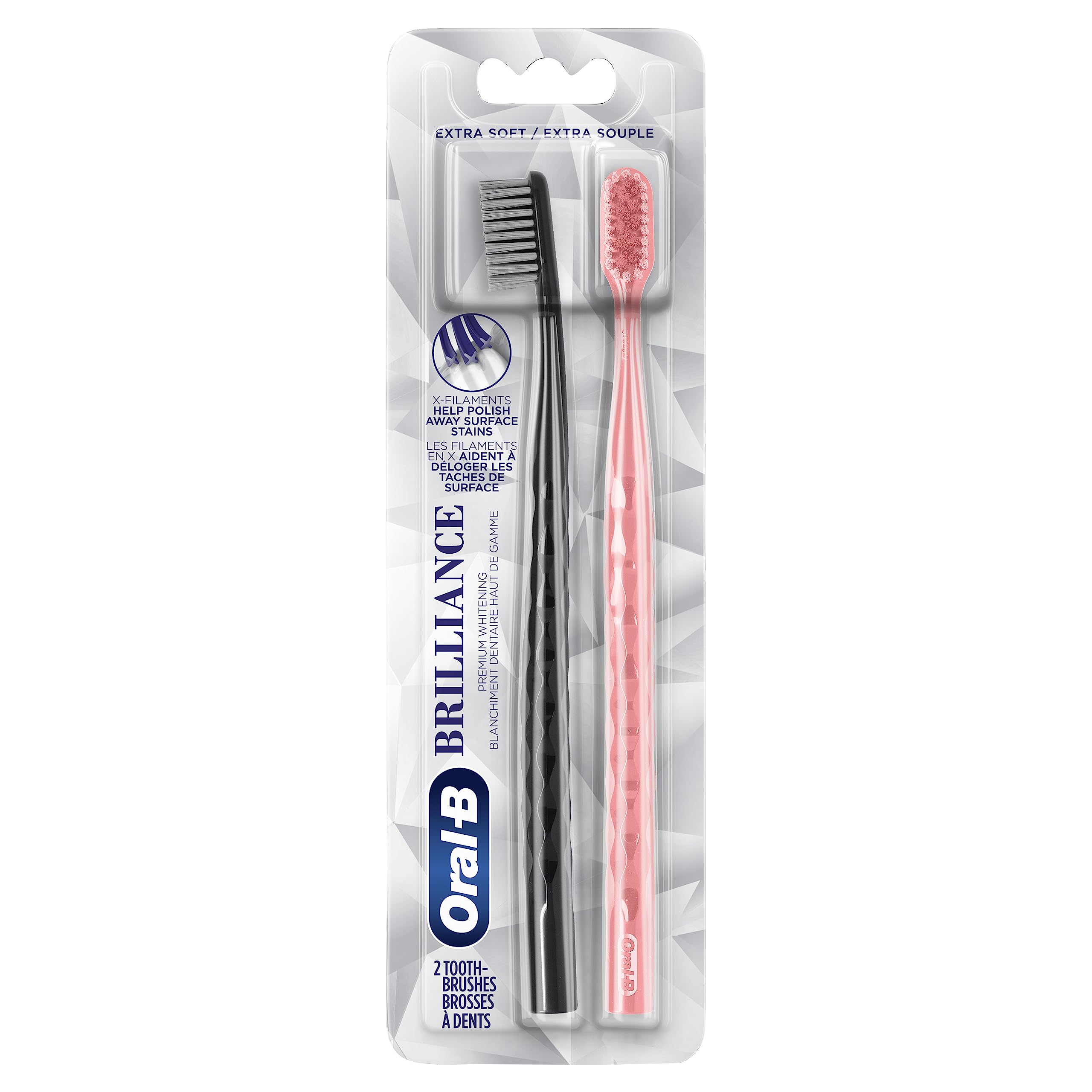 The Oral-B Brilliance 2-pack is ultra soft and beautifully designed with a stylish grip. They feature ultra dense bristles to ensure a soft gentle clean while using X-filaments to help polish away surface stains. Oral-B is the #1 Toothbrush Brand Used by Dentists Worldwide. A new toothbrush cleans 95% better in hard-to-reach areas compared to a worn out one. Oral-B Brilliance is a great addition to any bathroom to bring that ROYAL whitening experience to your everyday. Colors may vary.