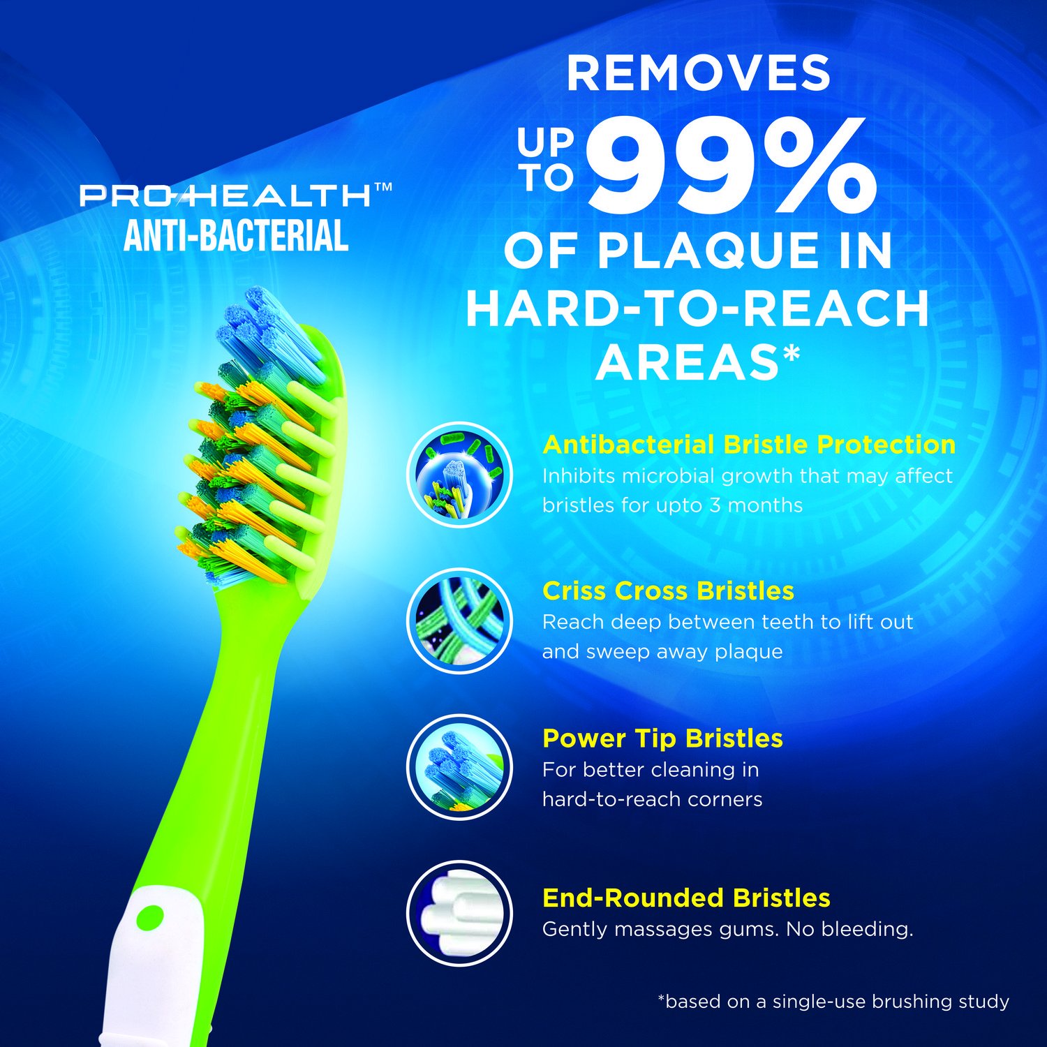 Oral-B pro-health anti-bacterial^ with anti-bacterial bristle protection helps keep bristles cleaner between brushing. It inhibits microbial growth that may affect the bristles for up to 90 days. The bristles do not kill bacteria in the mouth or protect you against disease. Always clean the product thoroughly after use. Bristles contain an antimicrobial to keep them cleaner. Does not kill bacteria in the mouth or protect against disease. About Oral-B pro-health: Oral-B is the worldâs no1 toothbrush brand which brings to you and your family revolutionary brushing solutions with best in class technology to ensure you and your family get healthier and cleaner mouth. Oral-B pro-health has been clinically proven to remove more plaque than a regular manual toothbrush with its crisscross bristles which are angled at 15 degree to attack plaque from the right angle. Angle. Removes up to 90% of plaque with perfectly angled crisscross bristles and has 35% more flexible bristles suited for your sensitivity needs helps clean hard-to-reach places with power tip bristles is gentle on enamel and gums for sensitivite teeth for complete oral care it is recommended that you visit your dentist regularly