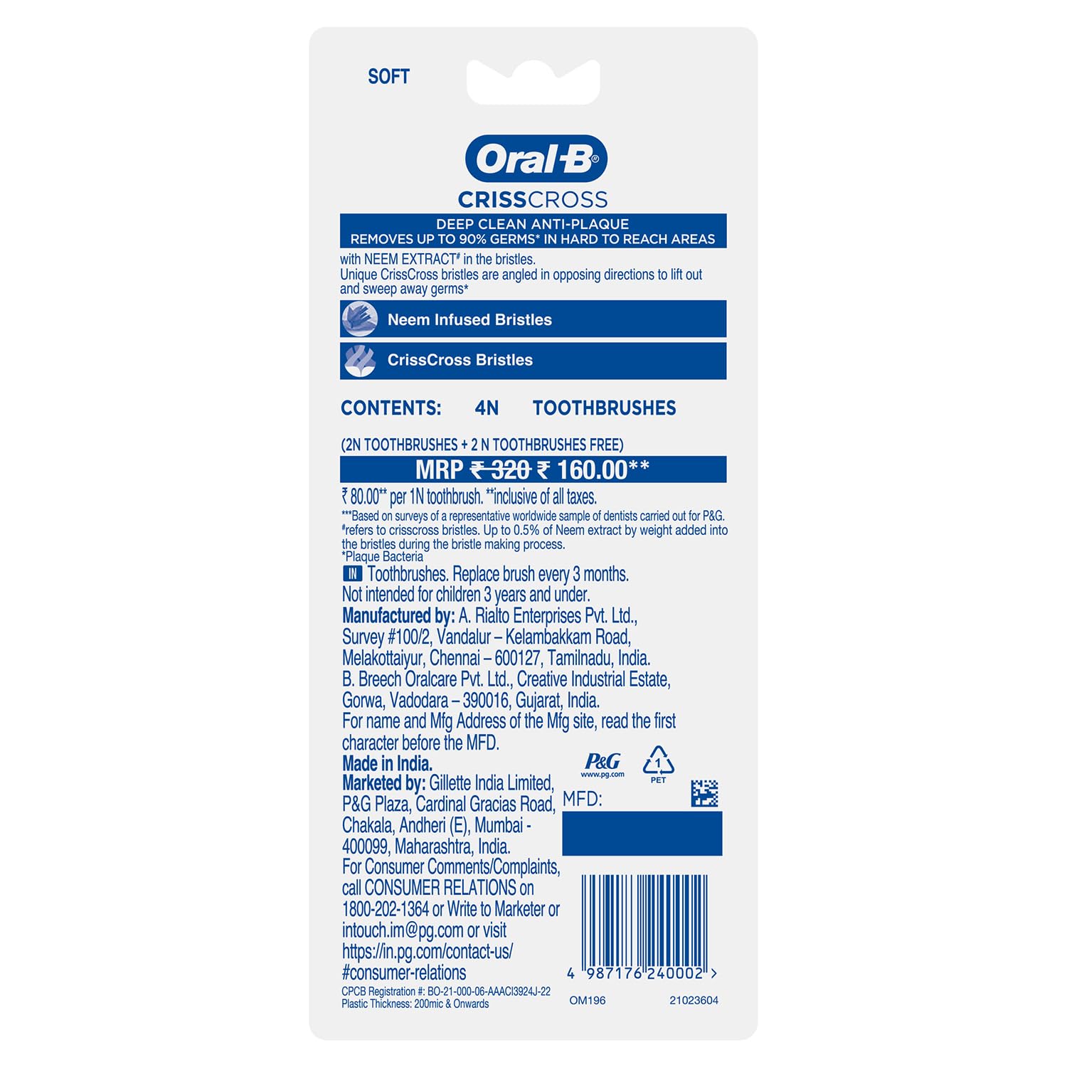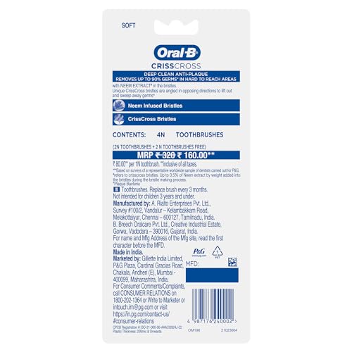 Oral B the world's #1 dentist-recommended brand brings you revolutionary brushing solutions with best-in-class technology with proven results for a healthier Cleaner smile. Oral B Crisscross Neem Deep Clean Soft Toothbrush has uniquely angled Criss Cross bristles positioned at 16 degrees in opposing directions to effectively lift and remove 90% of plaque from the deepest corners of your mouth. Integrated tongue Cleaner for maintaining fresh breath and a cleaner mouth. Neem-infused bristles combined with a powerful tip to provide natural antibacterial properties for effective cleaning. Designed with an ergonomic handle and cushioned grip for comfortable and controlled brushing ensuring ease of use and precision. Experience a superior Clean and healthier gums with Oral B Crisscross Neem Deep Clean Soft Toothbrush.
