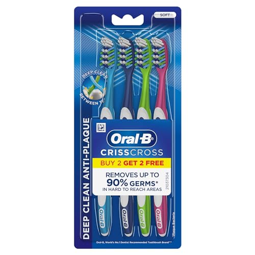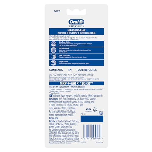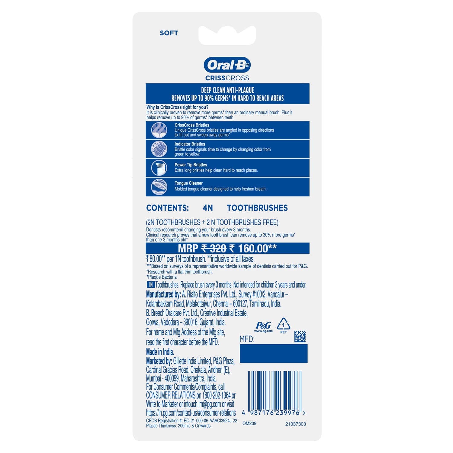 Oral B the world's #1 dentist-recommended brand brings you revolutionary brushing solutions with best-in-class technology with proven results for a healthier Cleaner smile. Oral B Crisscross Deep Clean Soft Toothbrush has uniquely angled Criss Cross bristles positioned at 16 degrees in opposing directions to effectively lift and remove 90% of plaque from the deepest corners of your mouth. Integrated tongue Cleaner for maintaining fresh breath and a cleaner mouth. It is Soft on delicate gums and enamel without compromising an effective clean. End-rounded bristles combined with a powerful tip designed for precise and gentle Cleaning. Designed with an ergonomic handle and cushioned grip for comfortable and controlled brushing ensuring ease of use and precision. Experience a superior Clean and healthier gums with Oral B Crisscross Deep Clean Soft Toothbrush.