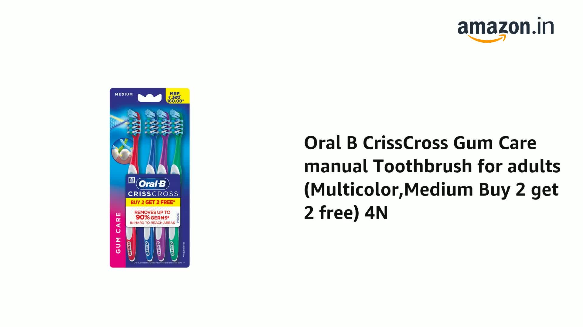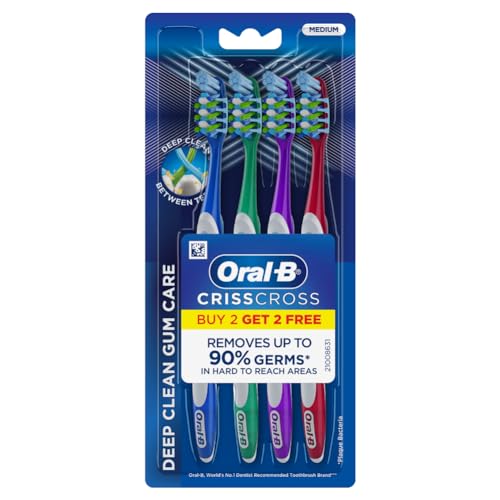 Oral B the world's #1 dentist-recommended brand brings you revolutionary brushing solutions with best-in-class technology with proven results for a healthier Cleaner smile. Oral B Crisscross Gum Care Deep Clean Medium Toothbrush has uniquely angled Criss Cross bristles positioned at 16 degrees in opposing directions to effectively lift and remove 90% of plaque from the deepest corners of your mouth. Integrated tongue Cleaner for maintaining fresh breath and a cleaner mouth. Equipped with a gentle gum massager that stimulates gums for improved blood flow and overall gum health. End-rounded bristles combined with a powerful tip designed for precise and gentle Cleaning. Designed with an ergonomic handle and cushioned grip for comfortable and controlled brushing ensuring ease of use and precision. Experience a superior Clean and healthier gums with Oral B Crisscross Gum Care Deep Clean Medium Toothbrush.