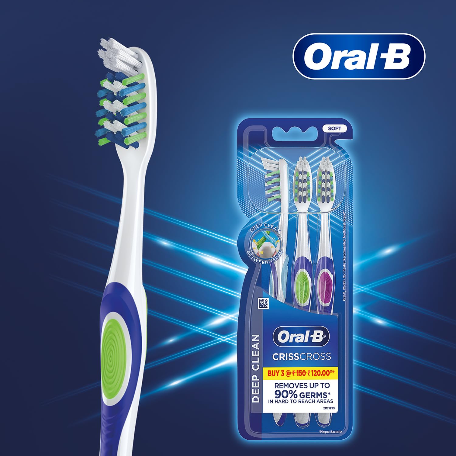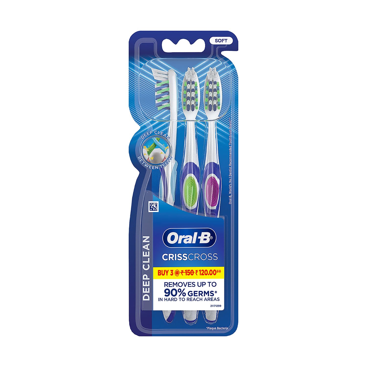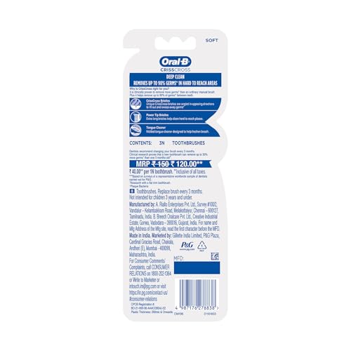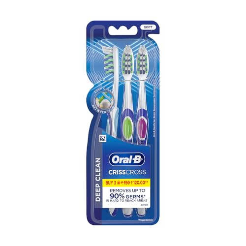 Oral B the world's #1 dentist-recommended brand brings you revolutionary brushing solutions with best-in-class technology delivering proven results for a healthier Cleaner smile. The Oral B Crisscross Soft toothbrush is gently removes germs without irritating sensitive gums. Engineered with Soft bristles to reach deep between teeth and along the gum line for a superior Clean. It helps reduce gum inflammation to promote overall gum health. An integrated tongue Cleaner helps maintain fresh breath and a cleaner mouth. Designed with an ergonomic handle for comfortable and controlled brushing. Experience a superior Clean and healthier gums with Oral B Crisscross Soft toothbrush.